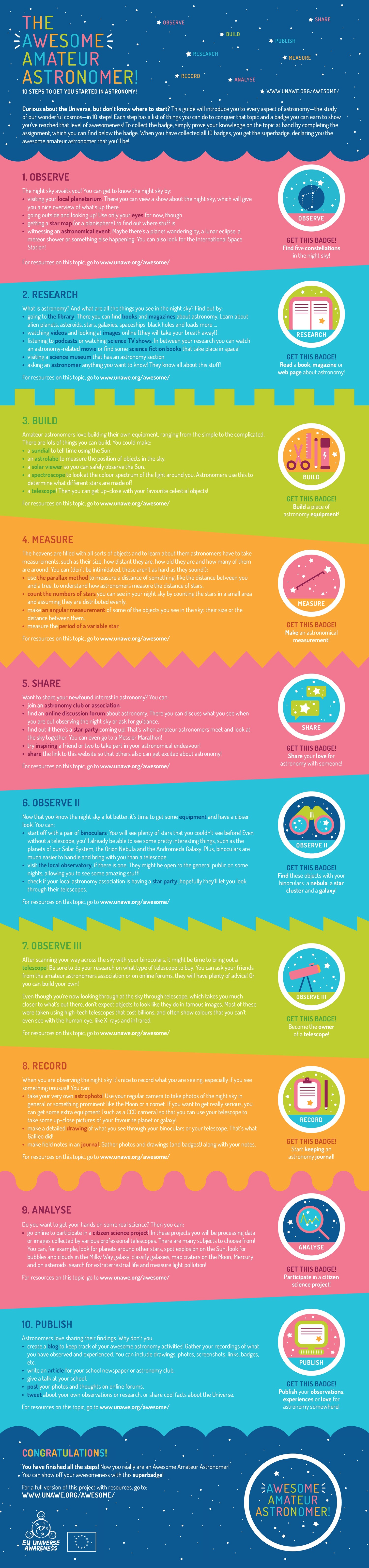 This 10-step guide will introduce you to every aspect of astronomy—the study of our wonderful cosmos! Each step has a list of things you can do to conquer that topic and a badge you can earn to show you've reached that level of awesomeness! To collect the badge simply prove your knowledge on the topic at hand by completing the assignment, which you can find below the badge. When you have collected all 10 badges, you get the superbadge, declaring you the awesome amateur astronomer that you’ll be! Then you can also join the ranks of other awesome people on the Wall of Awesome Amateur Astronomers! Just print these steps off to get started!