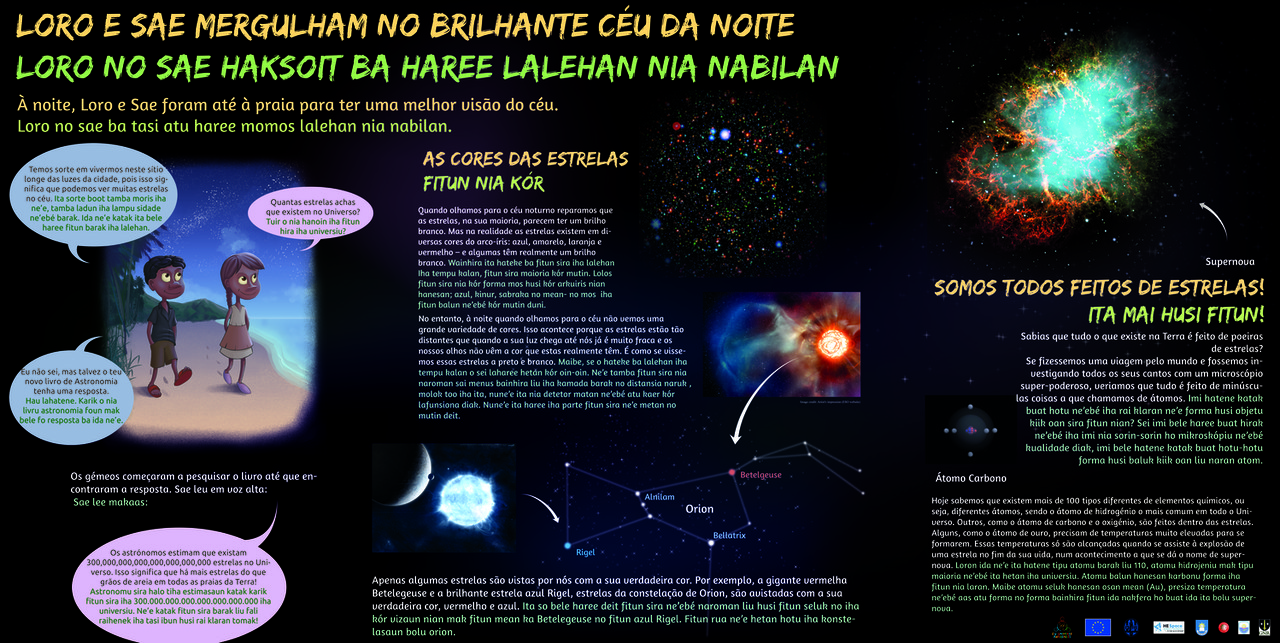 Partners: U Universe Awareness, Leiden Observatory / Leiden University, Escola Portuguesa de Díli e Ministério da Educação de Timor-Leste, Embaixada Portuguesa em Timor-Leste, Fundação Oriente, Alola Foundation, GNR Díli, Portuguese Astronomical Society, AstroBook Drive/ Boston University, ASTRON, Baader Planetarium, Berkeley Science Education Centre, Camões Institute, Ministério do Turismo de Timor-Leste, EurAstro, European Southern Observatory, Bosscha Observatory, Bandung Institute of Technology, Departamento de Física da Universidade Nacional Timor Lorosa’e, Foundation Leids Kerkhoven-Bosscha Fonds, HE Space Children’s Foundation, IAU Office of Astronomy for Development, NASA Sun-Earth Connections, PCs4kids, Art Sorrisus-Dental Implant Institute, Sália Pharmacy