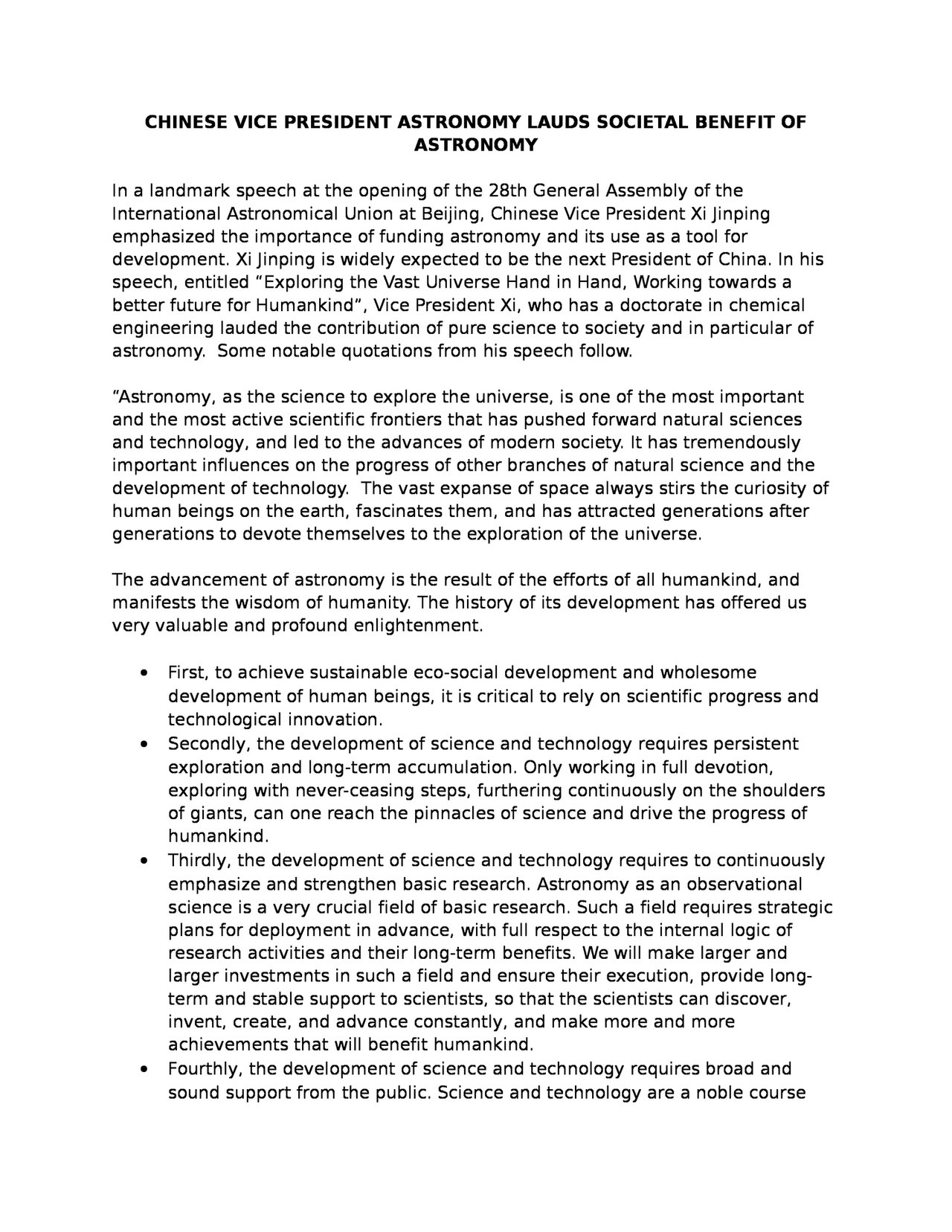 Chinese Vice President Lauds Societal Benefit of Astronomy