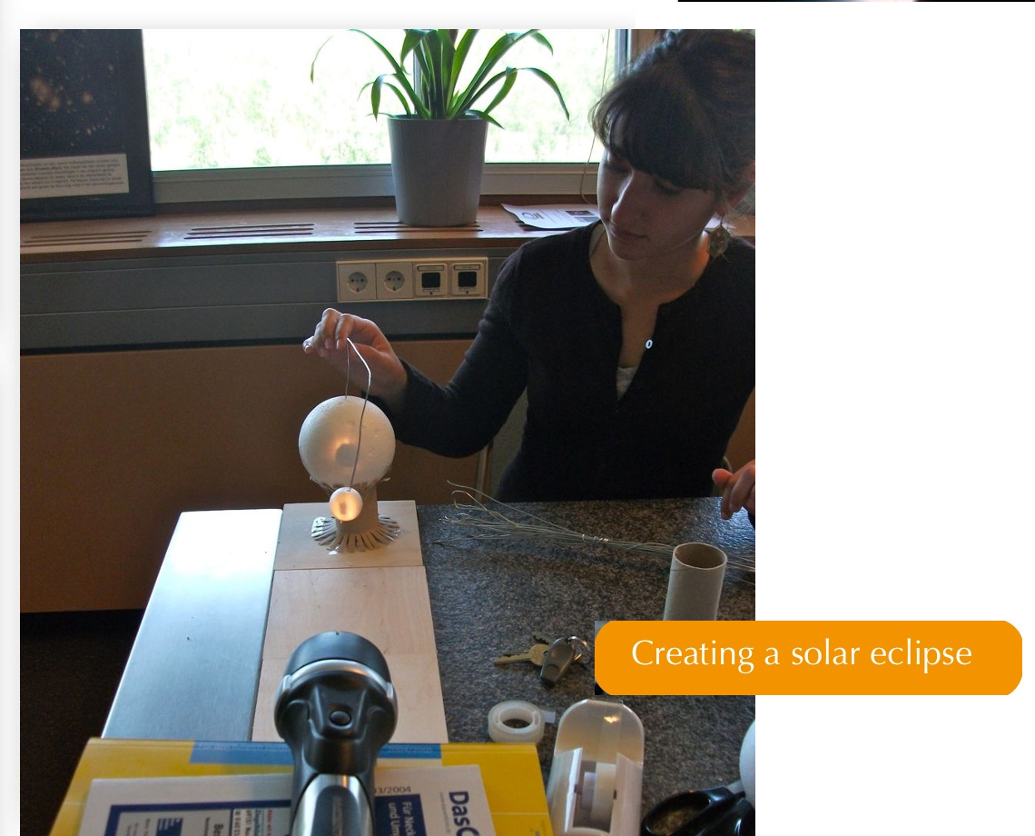 Create a solar eclipse: Stand facing the torch and swing the wire around until the Moon casts a shadow on the Earth; if necessary, dim the lights in the room. The Moon is now positioned between the Earth and the Sun and is blocking the “sunshine” for some people on Earth. Point out that only people directly in the shadow will see a complete eclipse of the Sun. You can show how the shadow moves by slowly rotating the wire (Image 10).