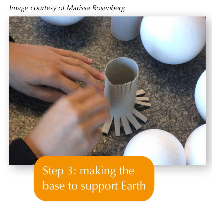 Using tape or glue, attach the larger ball to the top of the tube. This ball represents the Earth (Image 7).