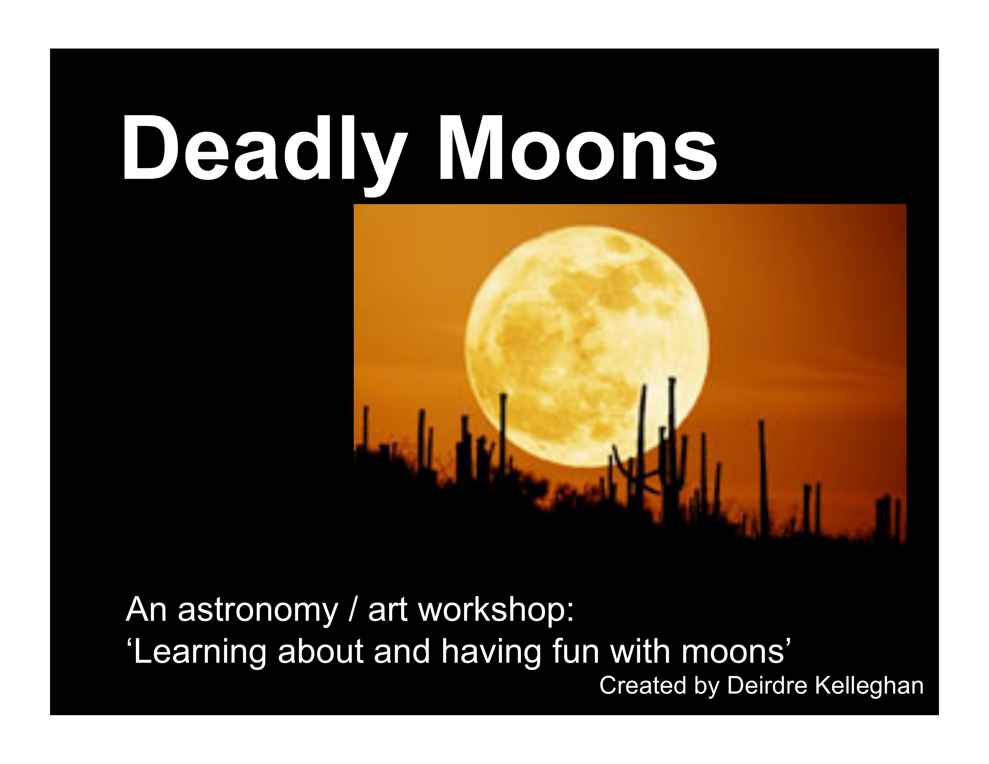 EvaluationDid you have fun with Deadly Moons? What is your ‘deadliest moon’? Why do you like it? Did you learn something new about The Moon? What do you see when you look at the Moon at night? Many of the other moons in the Solar System are named after characters in myths and legends. If you could, what would you name our Moon? What is the name of the line between day and night on the Moon? What is the most surprising thing you learned in this workshop?