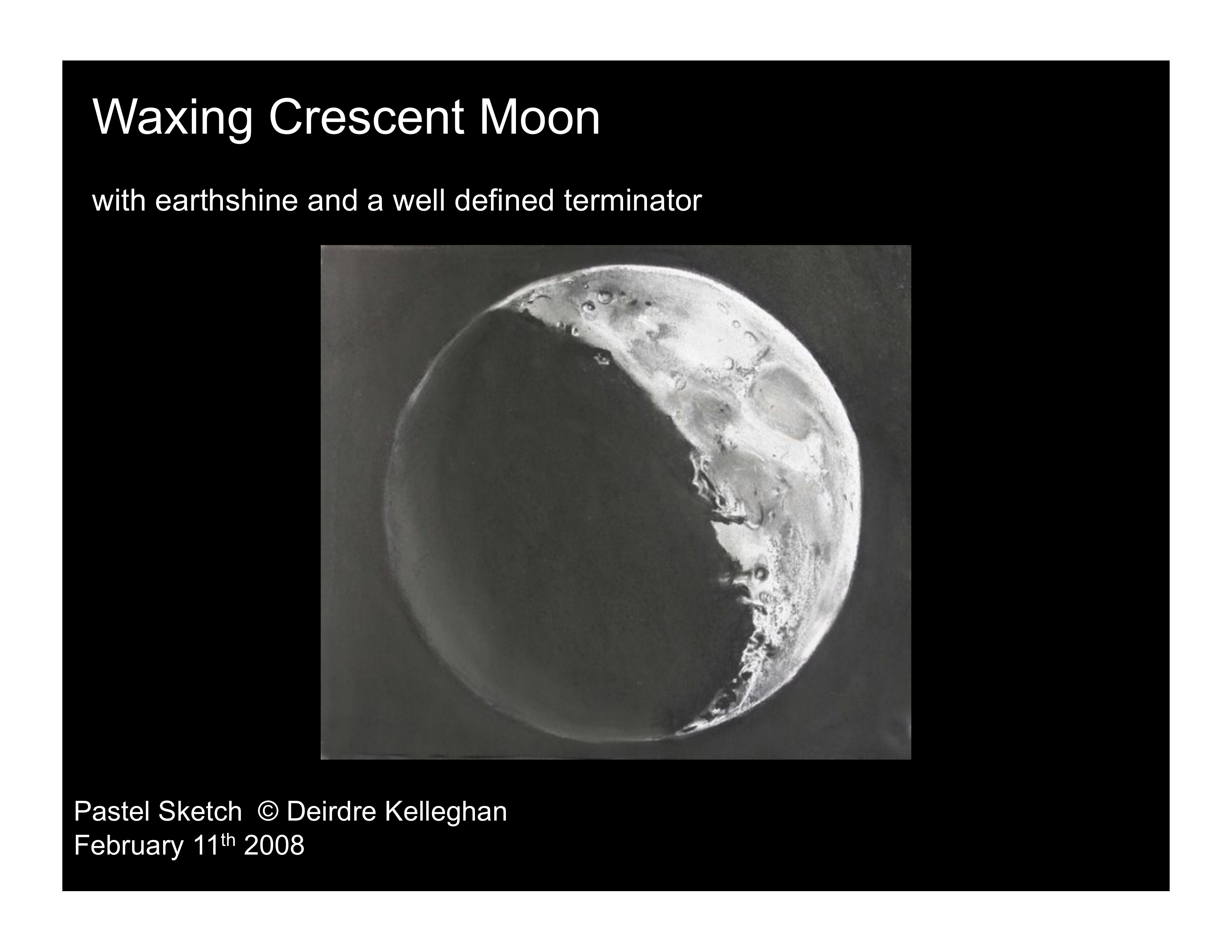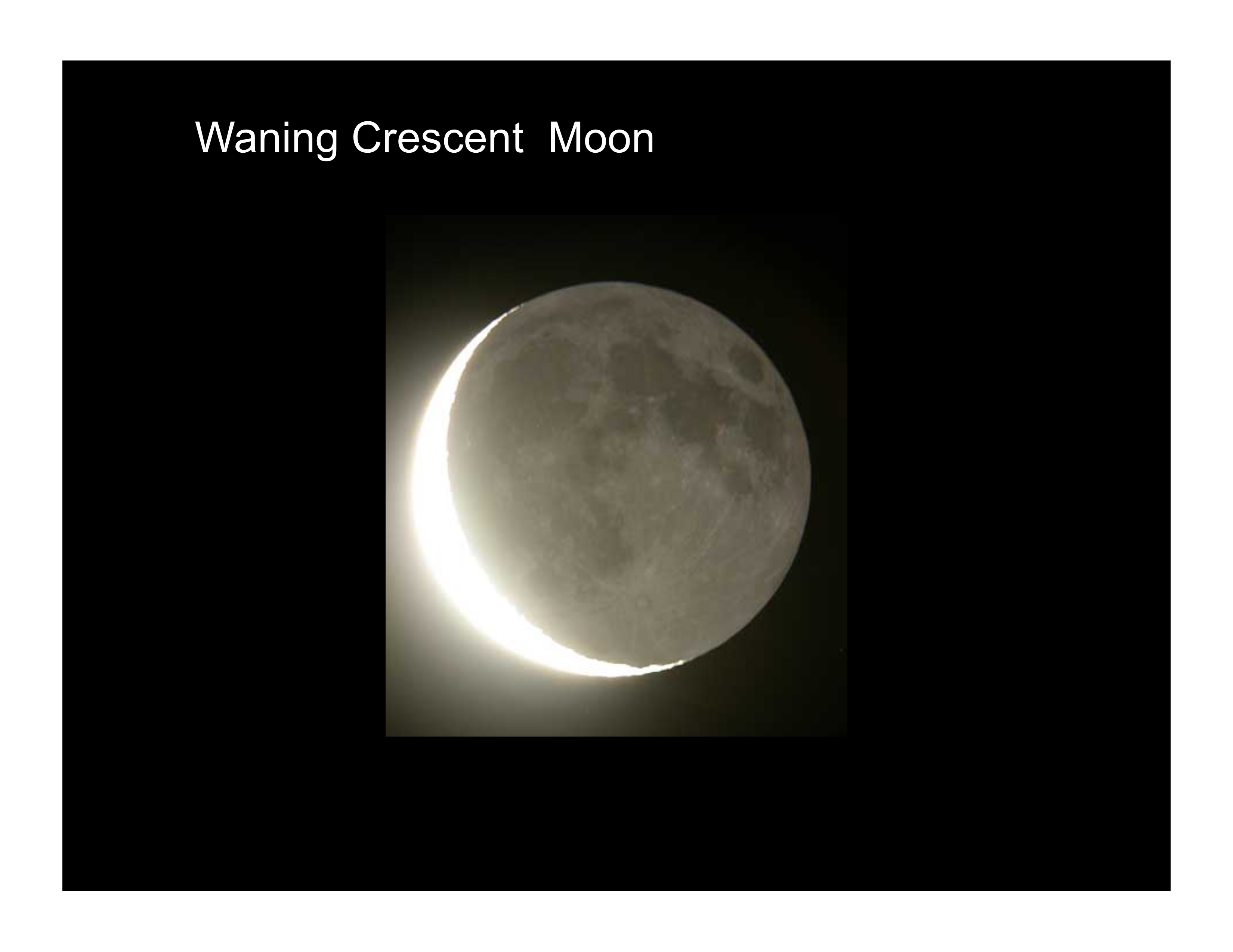 - Waxing Crescent: The black area is the night on the Moon, where the Sun is not shining. The brighter area is the day on the Moon, where the Sun is reflecting brightly off its surface. The line on the Moon between the night and the day is called ‘The Terminator’, like the movie of the same name. The bright area, just visible on the edge of the dark limb, is called ‘earthshine’. The Sun shines on the Earth and that light bounces off of the Earth’s oceans and lights up some of the darkness on the Moon.