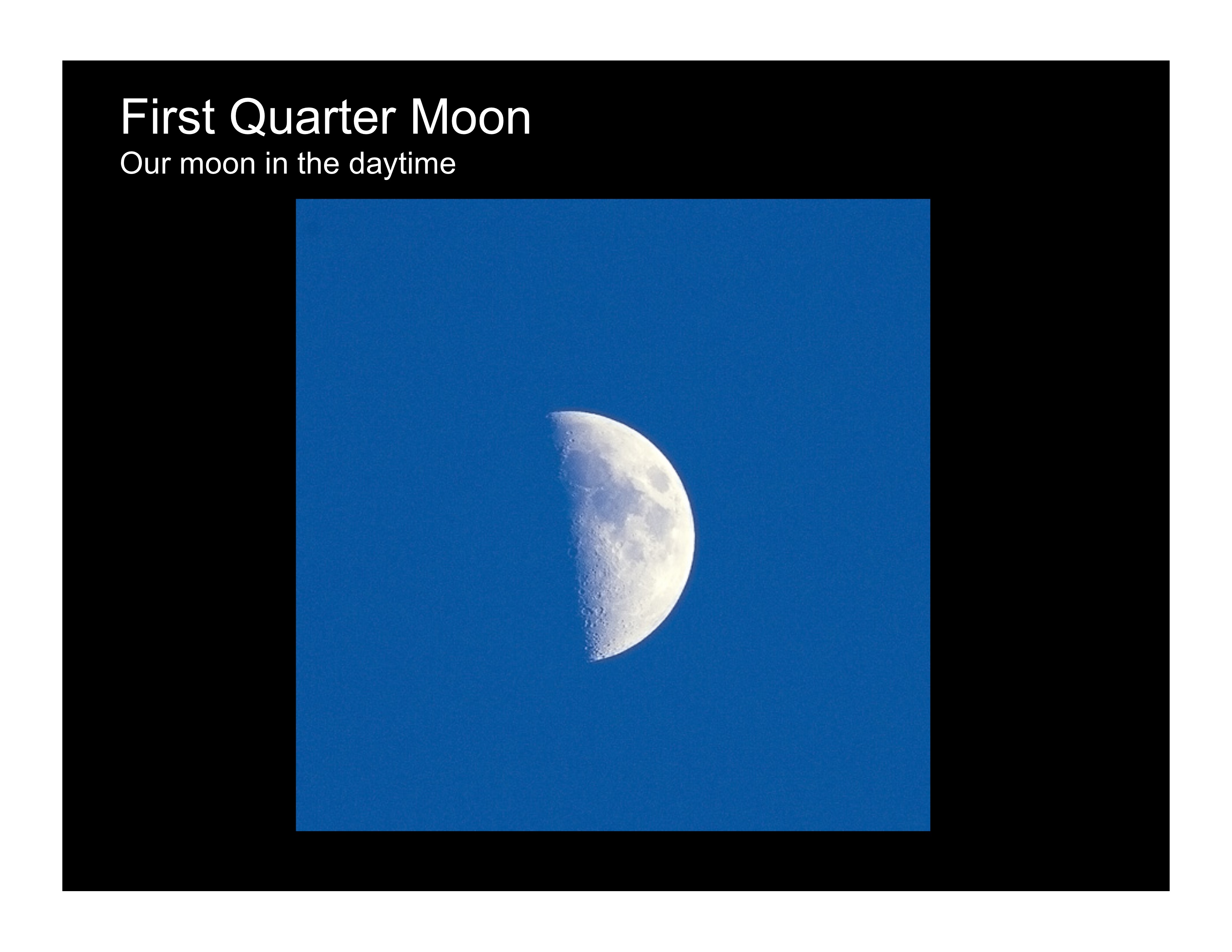 - First Quarter: The Moon looks like this when it is one-quarter of the way around the Earth in its monthly orbit. We see a quarter of it lit up from our place on Earth, but half of the Moon is lit up by the Sun shining on the Moon’s surface. All of the sunlight is on the right-hand side as we look at it from Earth. We can see a first quarter Moon in the evening or during the day depending on the time in the year. It’s nice to look at the Moon in the daytime against the blue sky.