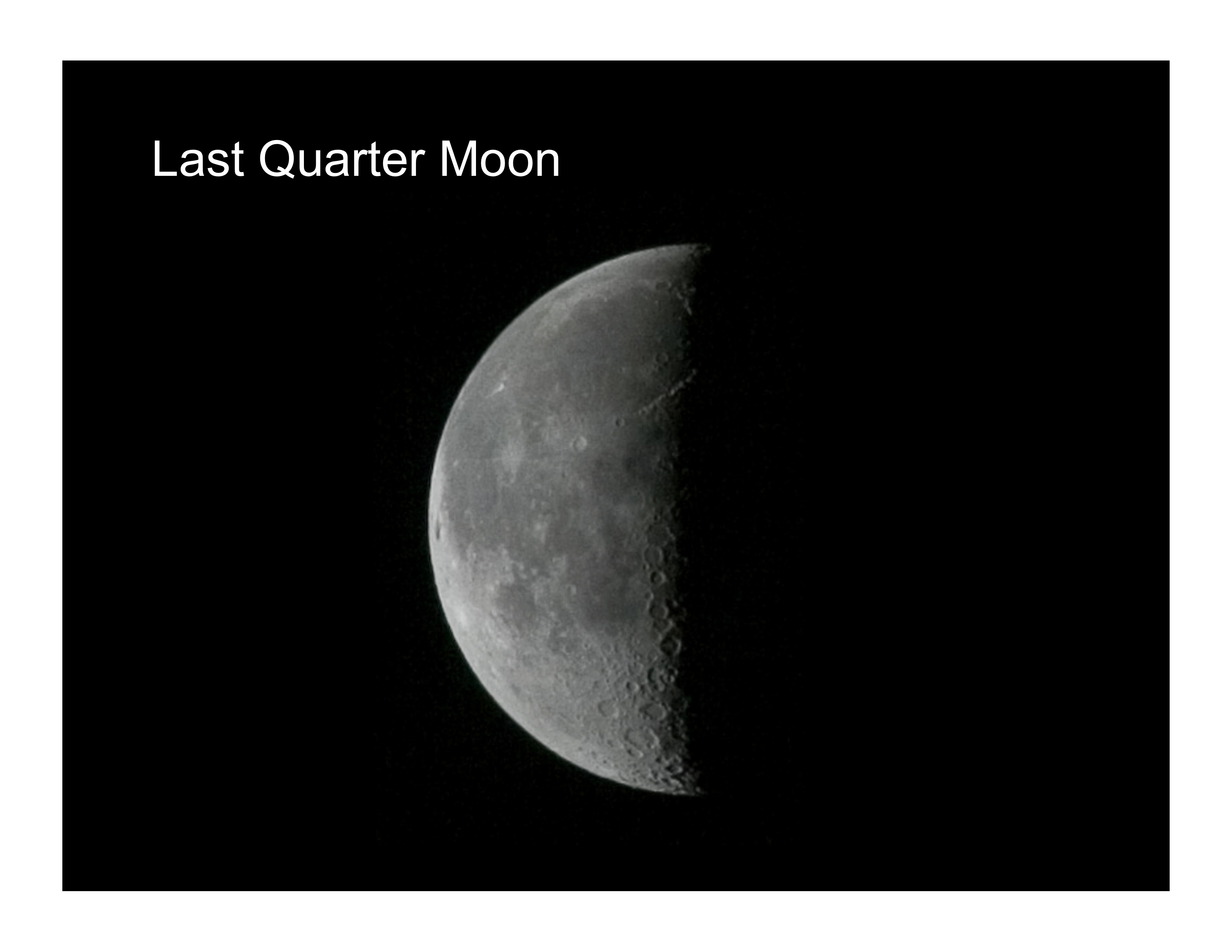 - Last Quarter: The Moon is three-quarters of the way around the Earth when it looks like this. All of the sunlight is now on its left-hand side.