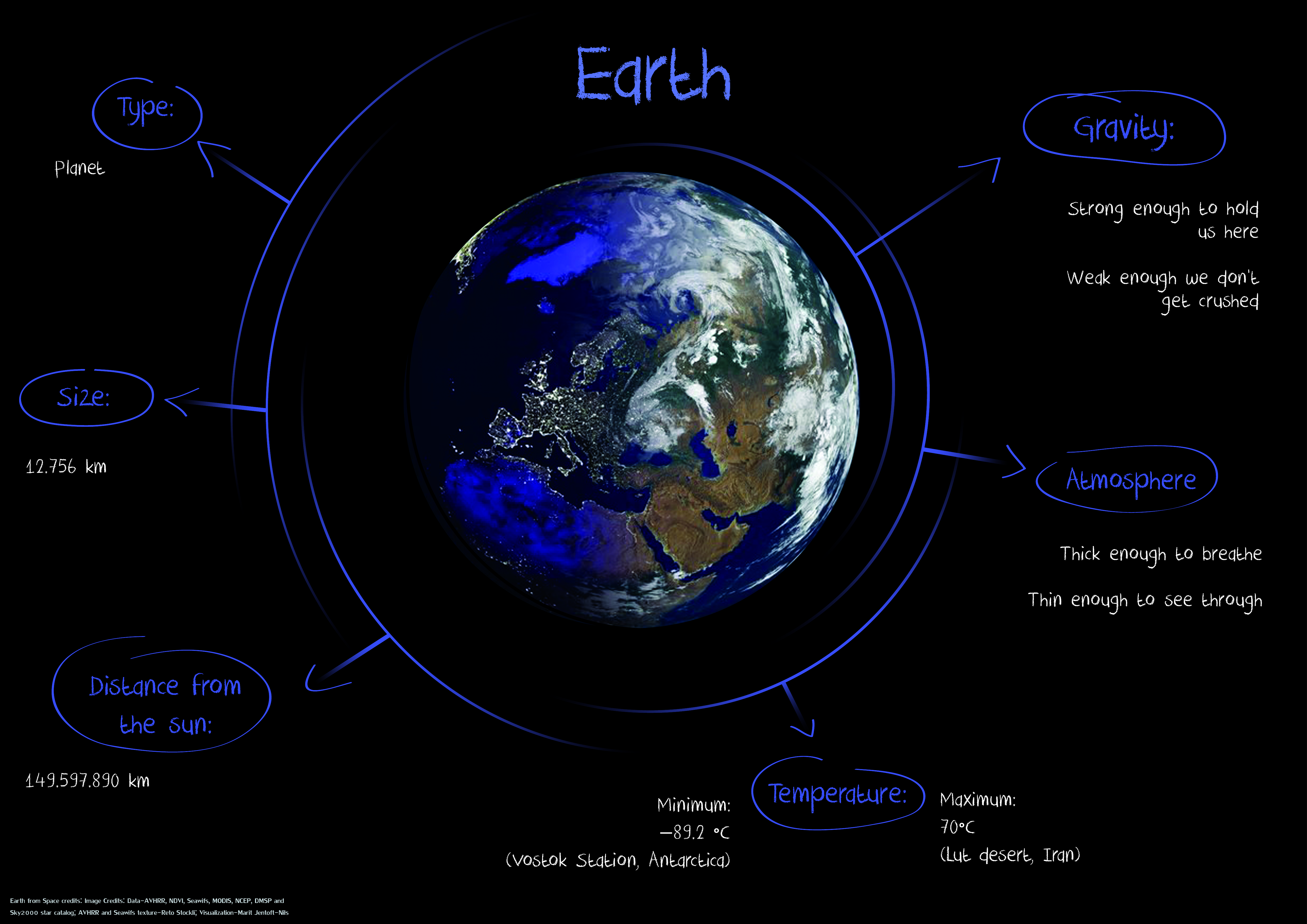 The following activity deals with both extra-terrestrial worlds and our home planet, Earth. By educating children about the life-essential conditions here on Earth and comparing them to those of other worlds, they learn that this is the only place in the universe that is suitable for life as we know it, which promotes respect for the environment and a sense of a global community.