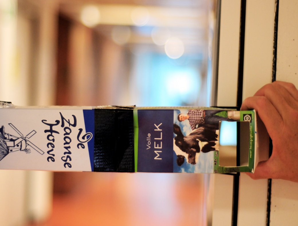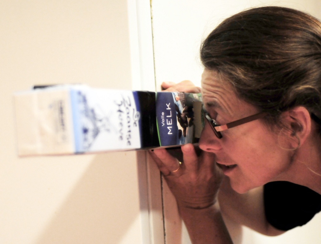 Hold the carton up and look through the window. Ask your partner to wiggle their fingers over the top. If what you see is tilted or distorted, adjust your mirror until it straightens out. If the mirror is loose, tape it in place. (Image 9)