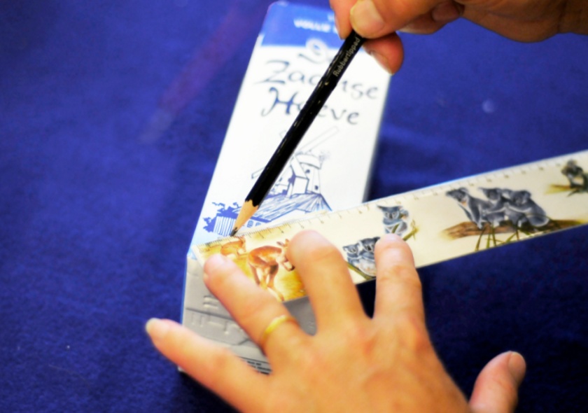 Lay the carton on its side so that the window is facing the right. Draw a line 45˚ from the bottom right-hand corner to where it meets the left hand edge. (Image 4)