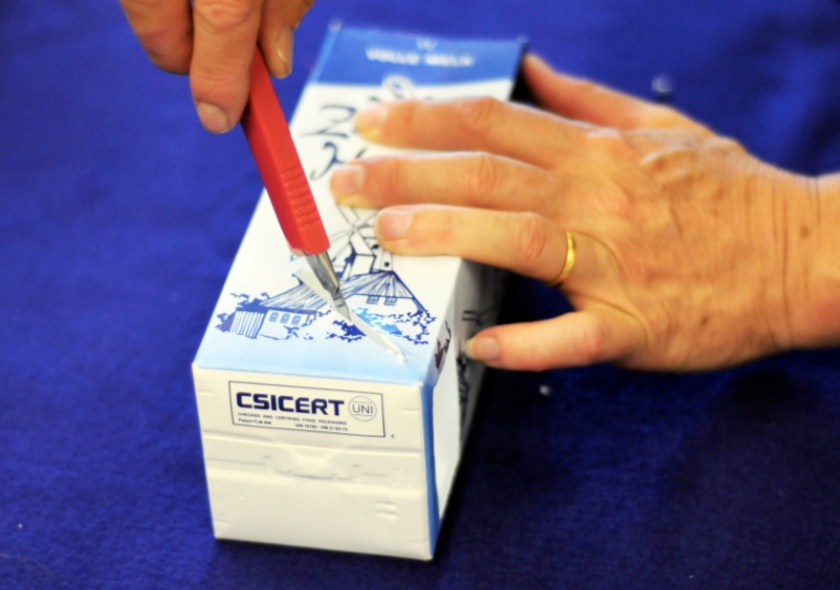 Using a cardboard cutter, ask a grown-up to make a window at the base of one carton. (Image 2)