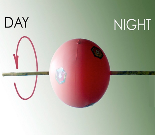 Pierce the ball with the stick, then hold them up and, using either a torch or daylight (e.g. through a window) for the Sun, demonstrate day and night to the children. The side of the ball in the light represents the side of the Earth experiencing daytime, the side in shadow demonstrates night-time. (Image 1)