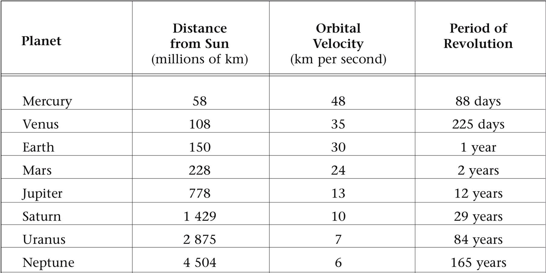 Refer to the Table of Planets’ Period of Revolution (Attachment 7) for the distance from the Sun, orbital velocity and revolution period of each of the planets in our Solar System, and Pluto.