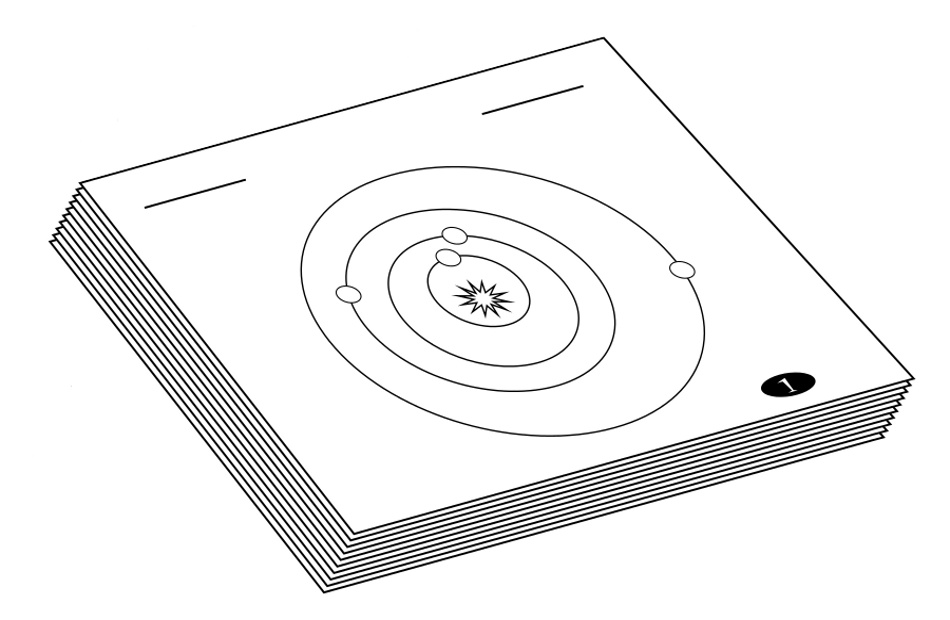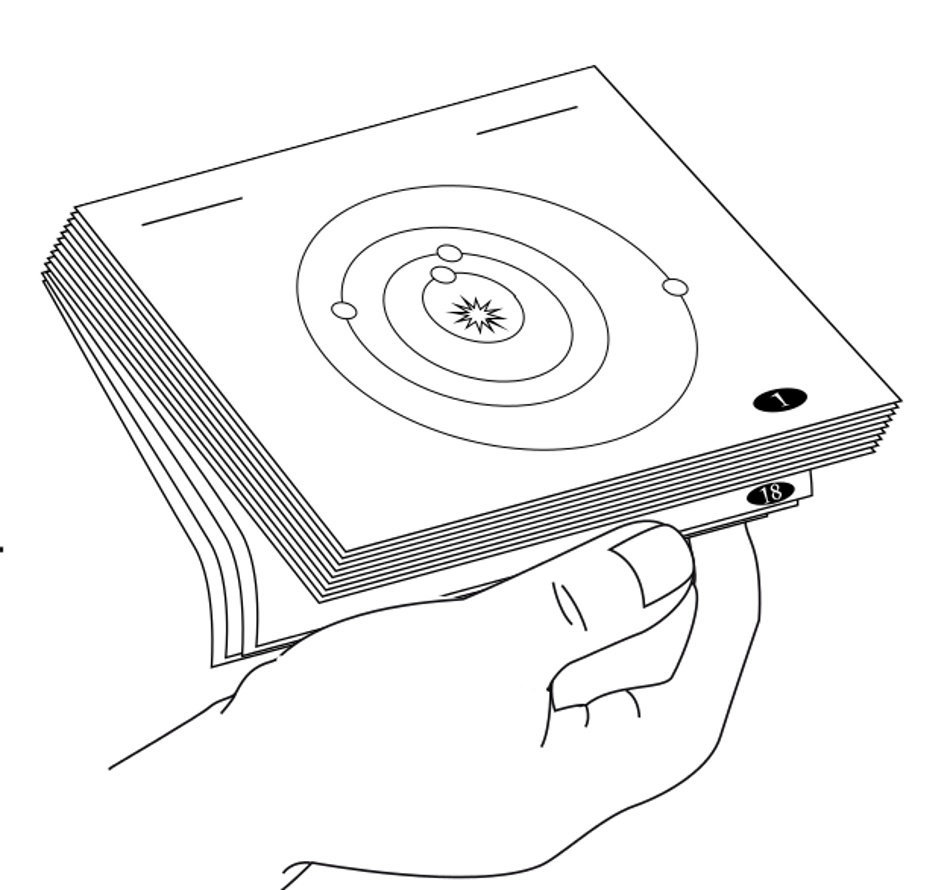 Explain to students that once they’ve finished step one, they can observe the orbital movement of the planets by holding the flip book in one hand and quickly flipping through the pages with the other. The planets should revolve around the Sun counter-clockwise. To produce this effect, flip the pages from top to bottom. (Image 2)