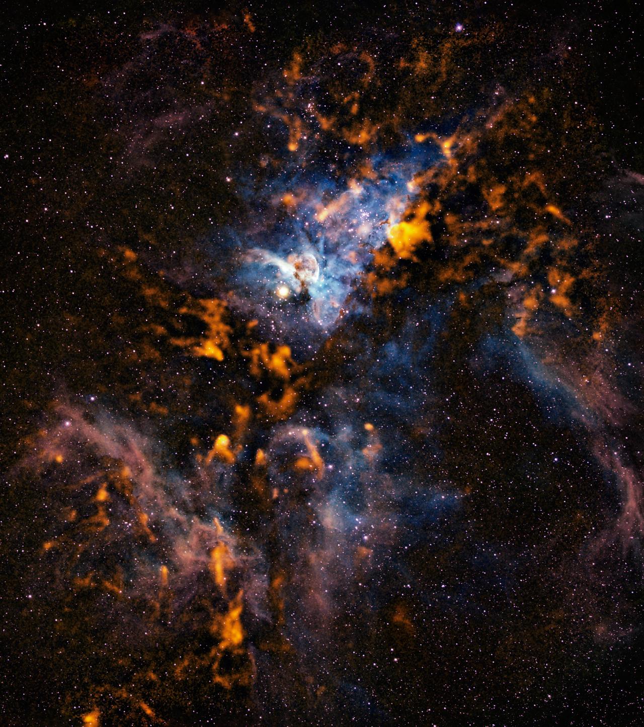 Astronomers often talk about stars being huge balls of gas, but they contain a lot of dust too. Take a look at this striking new picture of a region in space in which new stars are being born, called the Carina Nebula. The orange stuff makes up a big part of the picture – and that’s just dust!