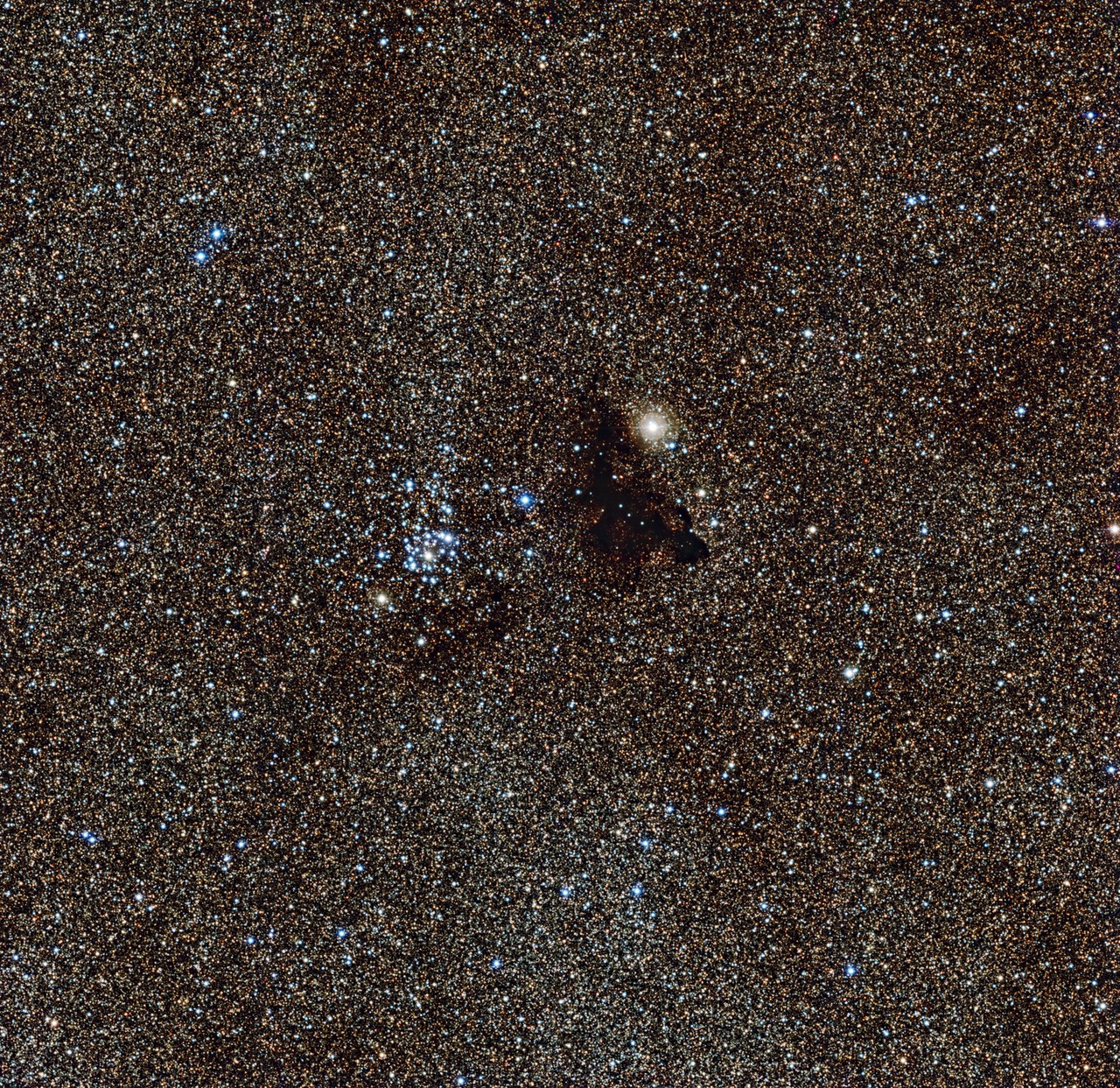 Podría parecer un agujero vacío en el telón de fondo de estrellas, pero esta zona oscura es de hecho una pequeña nube aislada de polvo situada delante del campo de estrellas. A nubes como esta las llamamos "glóbulos de Bok". Está hecha de pequeños granos de polvo que bloquean la luz de las estrellas de detrás y hacen que la región parezca vacía.