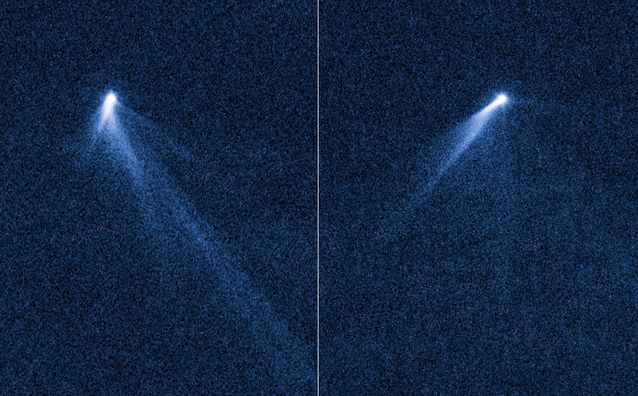 Well, the asteroid is spinning very quickly, causing its weak gravity to struggle to hold the rocky surface together, so it has started flying apart! The six comet-like tails streaming behind the asteroid are actually made of scattered dust and rock!