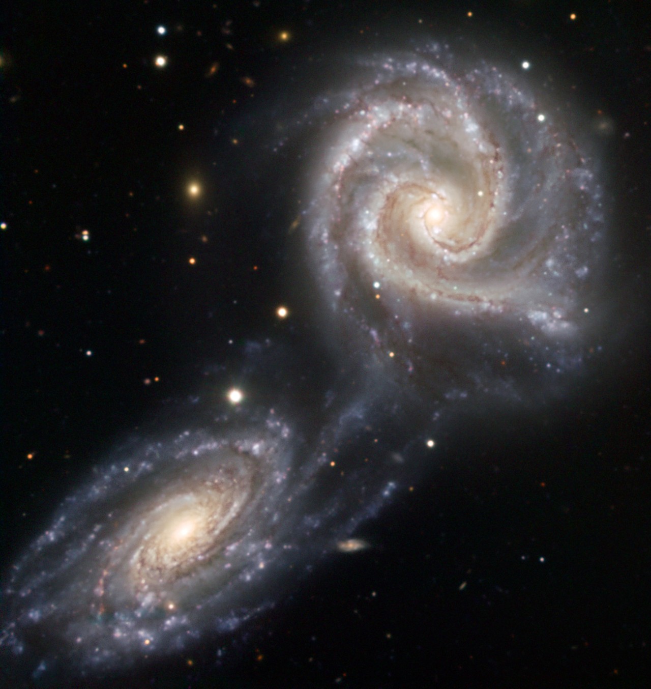 Throughout their lifetime almost every galaxy will be the victim of a cosmic collision. This can mean that two galaxies actually crash into one another, becoming disfigured and sparking a frenzy of new star birth. Or it can mean they pass close to each other and affect each other simply through the pull of their gravity.