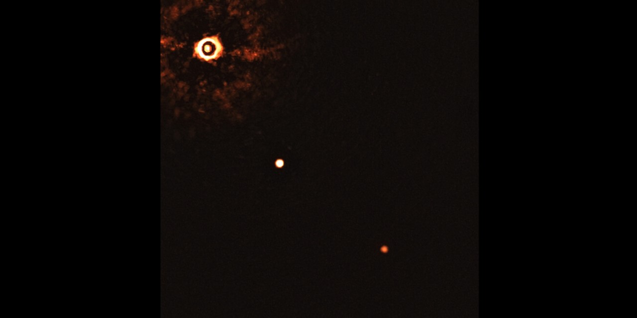 Esta imagem de família de uma estrela com dois exoplanetas é uma novidade! É a primeira vez que @s astrónom@s conseguem uma imagem de uma estrela jovem semelhante ao Sol (o círculo brilhante no canto superior esquerdo) e dois exoplanetas gigantes (os dois pontos mais pequenos na imagem).