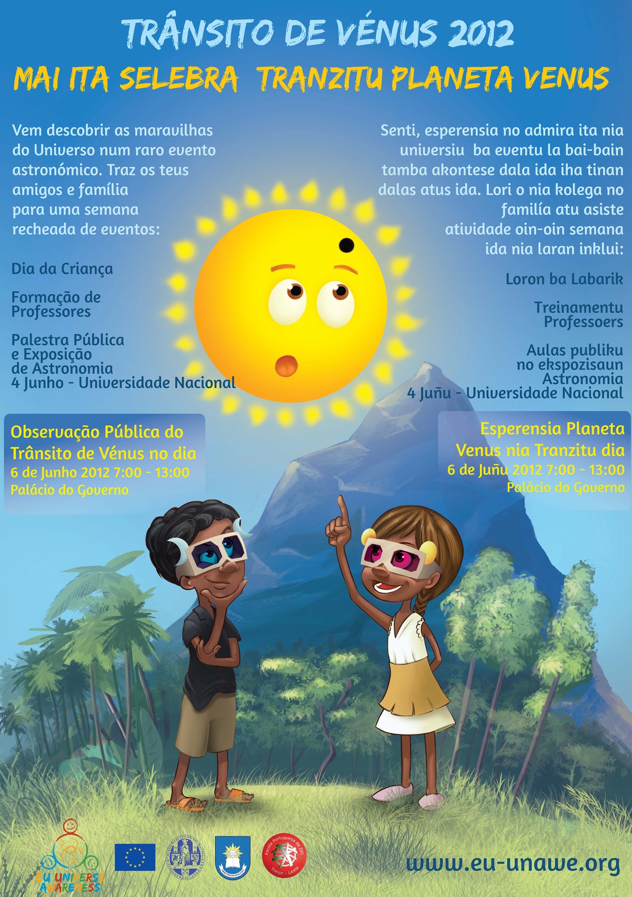 The UNAWE Transit of Venus 2012 in Timor-Leste is co-organised by Leiden University, the Ministry of Education of Timor-Leste and the Portuguese School in Díli in collaboration with Portuguese Embassy in Timor-Leste, Fundação Oriente, Alola Foundation, Guarda Nacional Republicana - Díli, HE Space Children’s Foundation, Portuguese Astronomical Society, AstroBook Drive/ Boston University, ASTRON, Baader Planetarium, Berkeley Science Education Centre, Camões Institute, Ministério do Turismo de Timor-Leste, EurAstro, European Southern Observatory, Bosscha Observatory, Bandung Institute of Technology, Departamento de Física da Universidade Nacional em Timor-Leste, Foundation Leids Kerkhoven-Bosscha Fonds, IAU Office of Astronomy for Development, NASA Sun-Earth Connections, PCs4kids, Art Sorrisus-Dental Implant Institute, Sália Pharmacy.