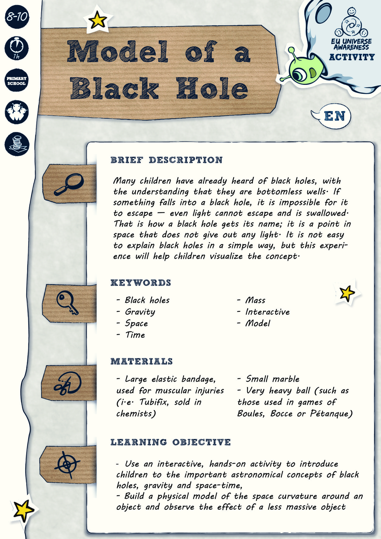 Many children have already heard of black holes, with the understanding that they are bottomless wells. If something falls into a black hole, it is impossible for it to escape — even light cannot escape and is swallowed. That is how a black hole gets its name; it is a point in space that does not give out any light. It is not easy to explain black holes in a simple way, but this experience will help children visualize the concept.