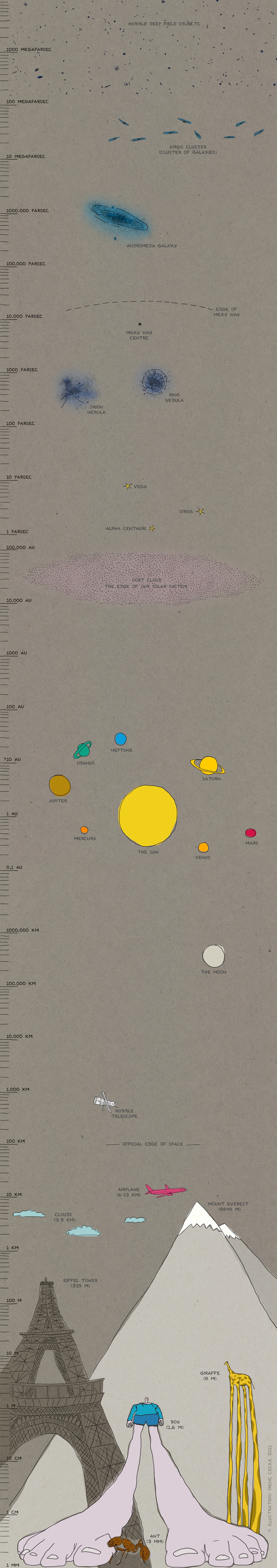 This poster is designed to be used as an educational tool in your classroom to show your students what lies in the Universe beyond the surface of our Earth. It has been drawn in such a way that the sizes of the object shown are not to scale (or, that the sizes of the objects are not correctly sized relative to one another). Instead, we have given a scale that shows where objects in our Universe are based on distance.