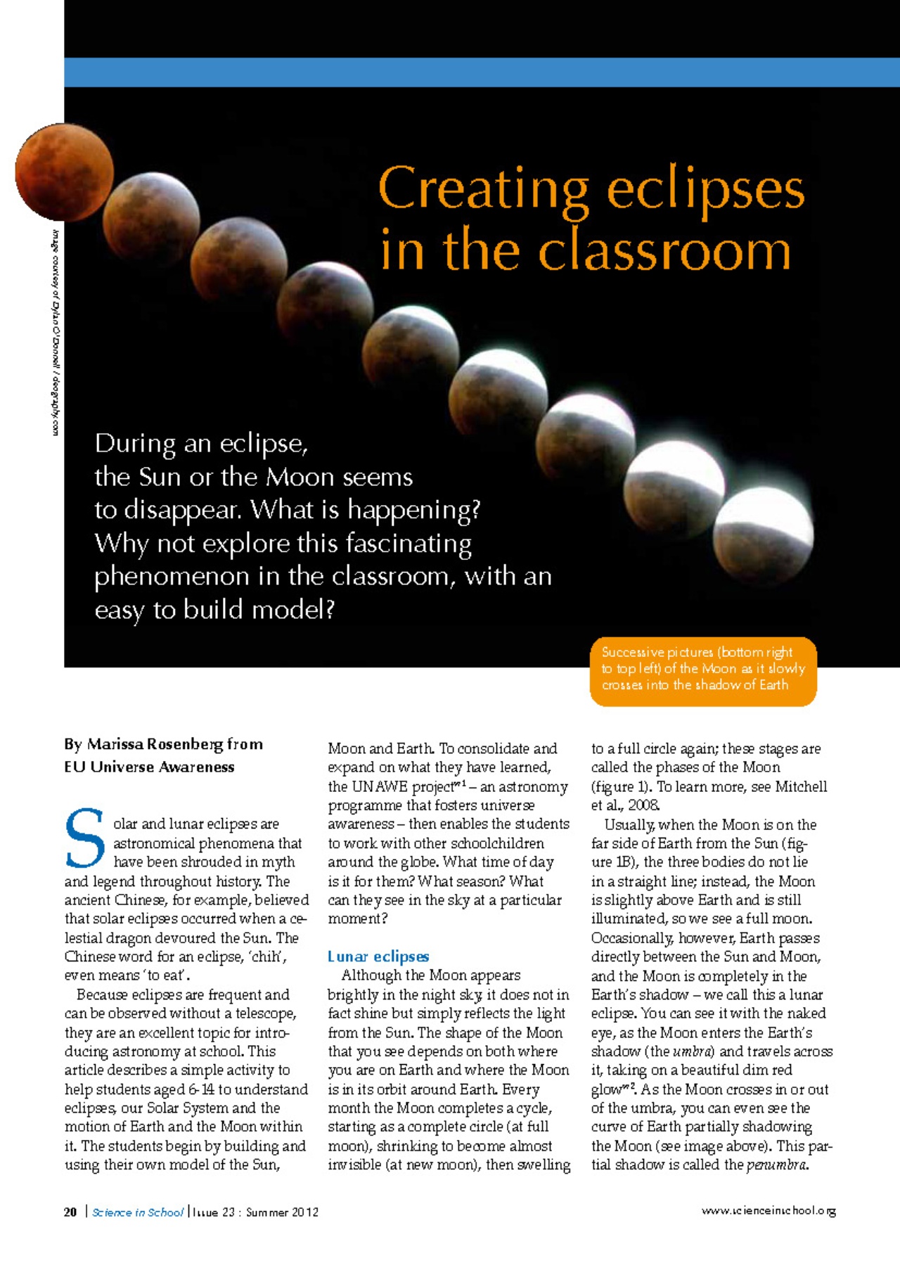 w4 – A comparison of lunar and solar eclipses Resources See the website of the Lunar and Planetary Institute for another classroom activity to model an eclipse On the NASA Science website is Lunar Eclipse 2105: a fun, scientifically accuratestory of an eclipse being viewed from our Moon by a young boy. It could be a good starting point for other lunar eclipse activities. For photographs and information about the lunar eclipse of 15 June 2011, which could be seen all over Europe To find out how two school students investigated and observed an eclipse in a prize-winning project, see:Pathmanathan P (2007) Students Catch a Star: researching and observing a solar eclipse. Science in School 7: 39-44. www.scienceinschool.org/2007/issue7/catchastar