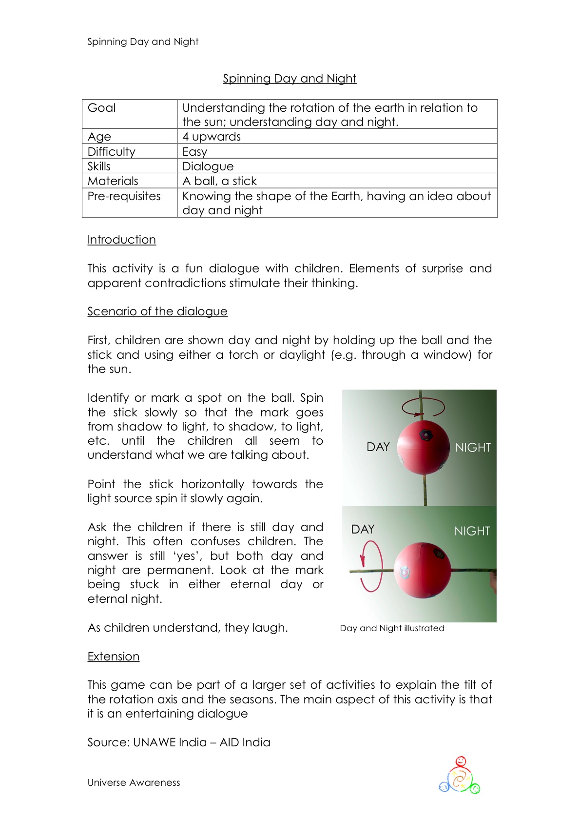 In this activity, understand the rotation of the Earth in relation to the Sun - understand day and night.