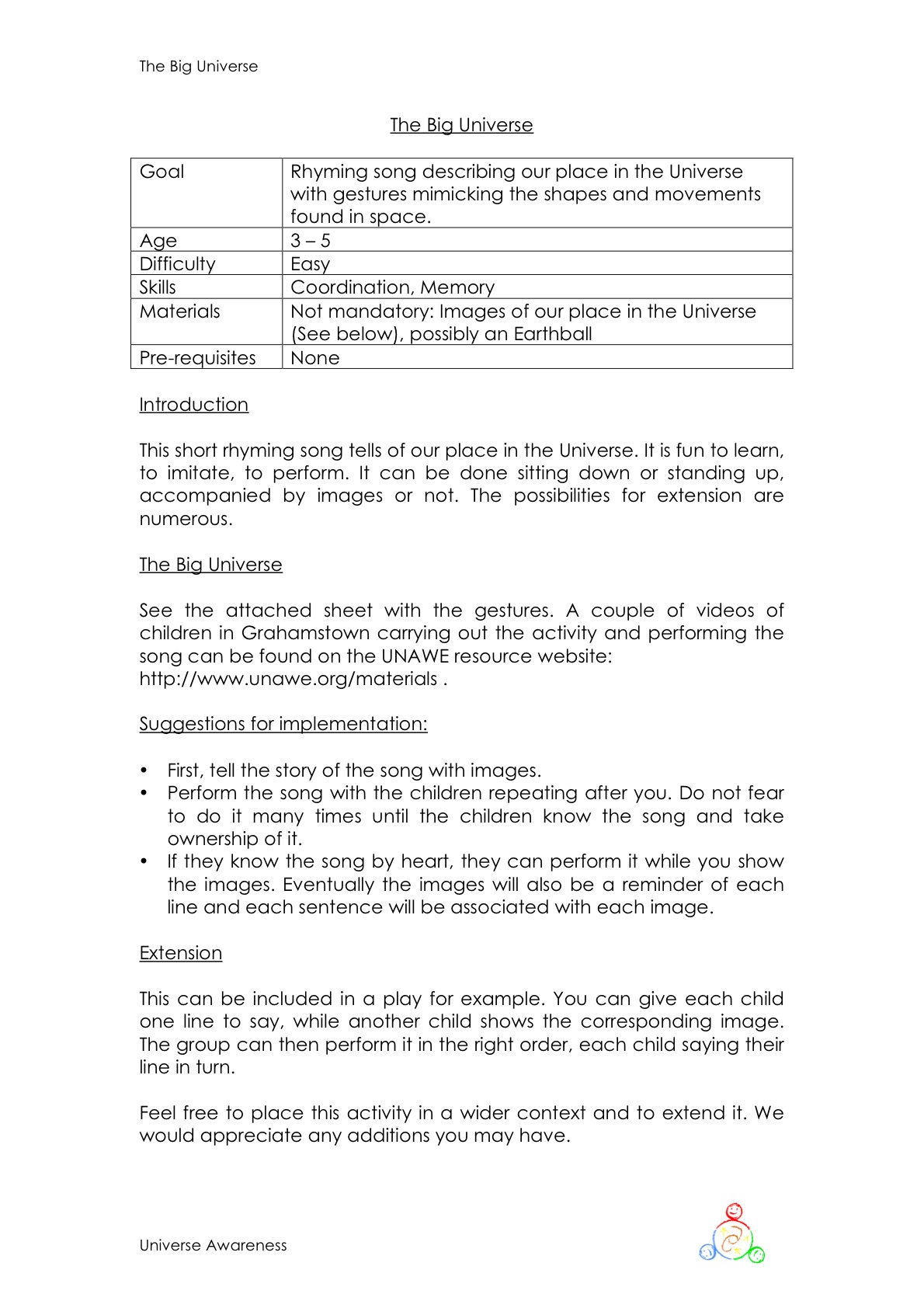 In this fun activity, use rhyming song to describe out place in the Universe with gestures mimicking the shapes and moments found in space.