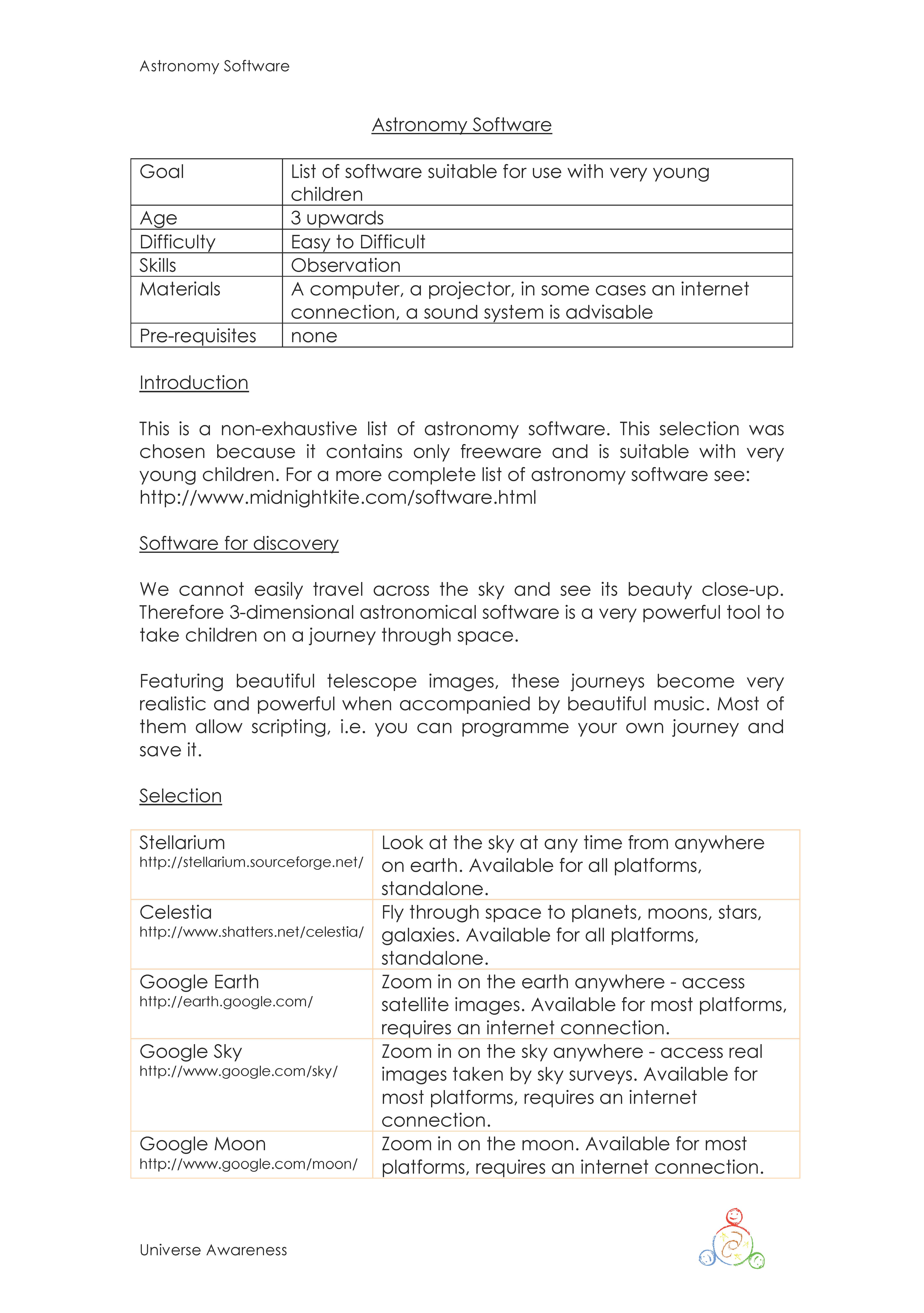 This is a non-exhaustive list of astronomy software. This selection was chosen because it contains only freeware and is suitable with very young children.