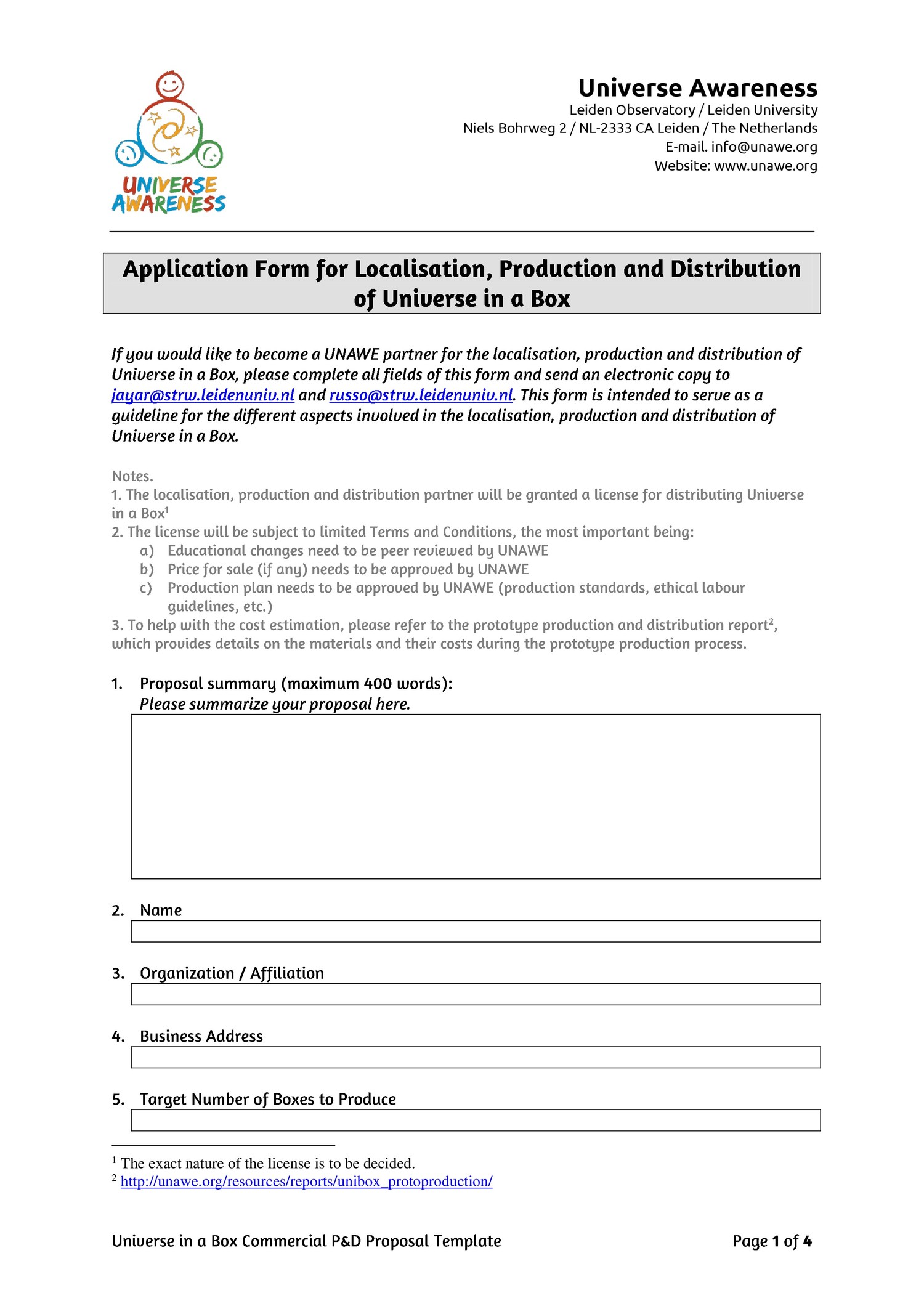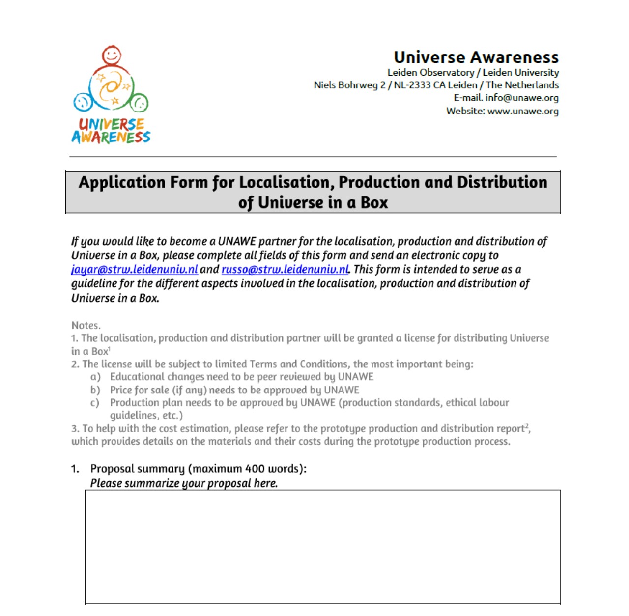 Proposal template for the localisation, production and distribution of Universe in a Box. Please download the DOC file from the right.