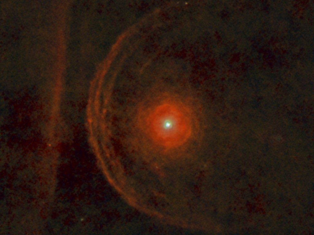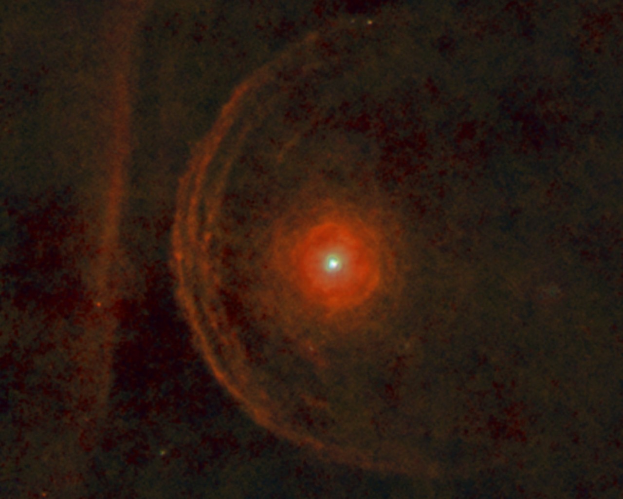 The star at the centre of this photograph is Betelgeuse. Betelgeuse rides on the shoulder of the constellation Orion the Giant (also known as Orion the Hunter).