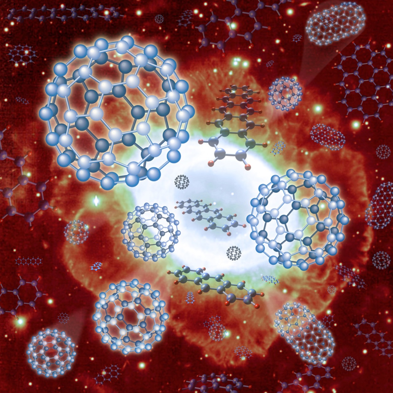 This weird-looking picture shows a number of molecules (Moll-eh-kyools), which are groups of two or more atoms stuck together. Molecules are so small that nobody can see them, except with extremely powerful microscopes. The football shaped molecules in this picture are made up of 60 carbon atoms, hence its name “C60”. Carbon is a very important chemical for all life on Earth. Is a big part of the world we live in, from the carbon dioxide in the air to the plants we eat. And almost one-fifth of our body is made up of carbon!