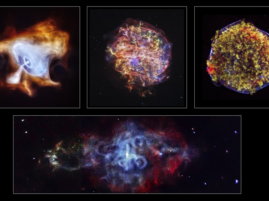 Moving from left to right, the objects are The Crab Nebula, 3292.0+1.8, Tycho’s Supernova and on the bottom is 3C58.