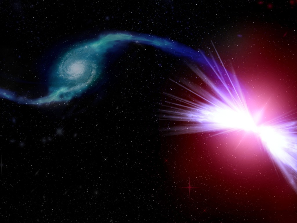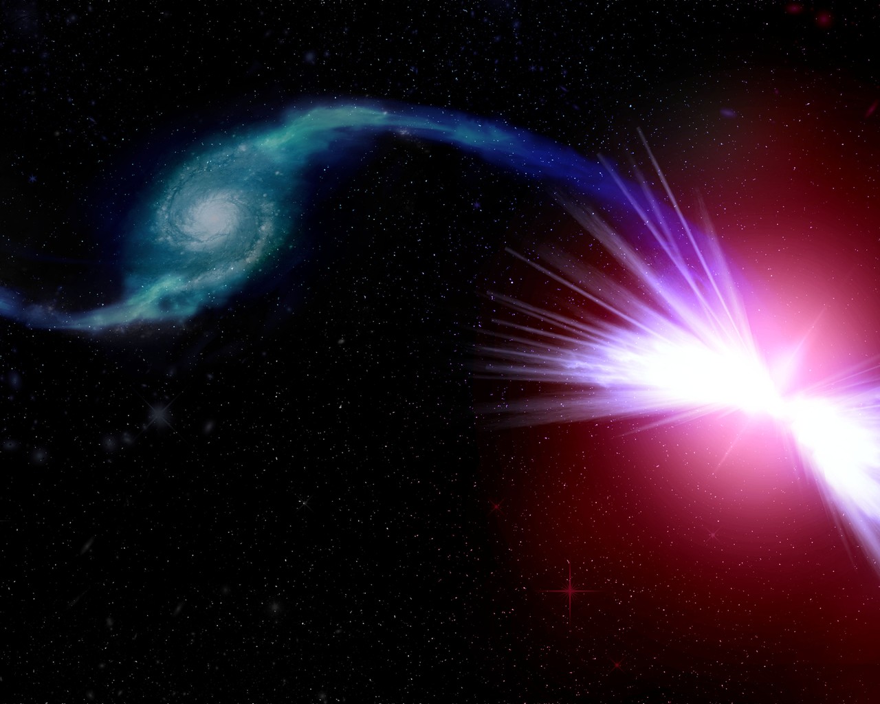 The picture above shows two galaxies, the bright pink galaxy on the right has an enormous, feeding black hole at the centre. If you look closely, you can see a stream of material being sucked from the blue galaxy into the black hole.
