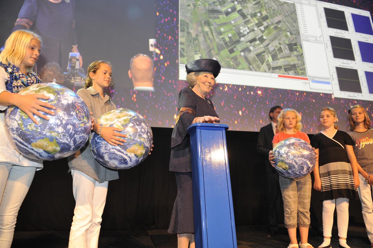 In the image, you can see five girls from Drenthe (Netherlands) holding Earthballs with Queen Beatrix during the official LOFAR inauguration ceremony.
