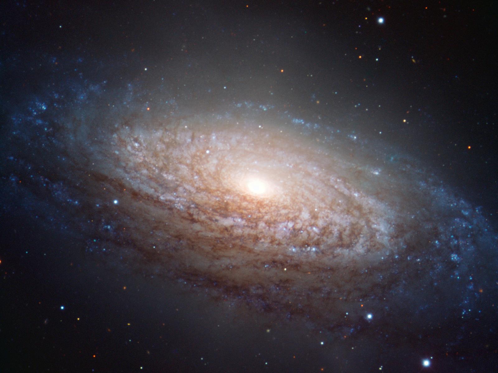 In the photo you can see that the colour of the galaxy is different in the centre and the outer regions. The galaxy looks more yellow and orange towards the centre (astronomers say it is “reddish”), while it is blue in the outer parts. This is because of the colours of the stars that are found in these regions of the galaxy. Older stars are redder than younger stars and live in the centre. Young stars are blue and live further out.