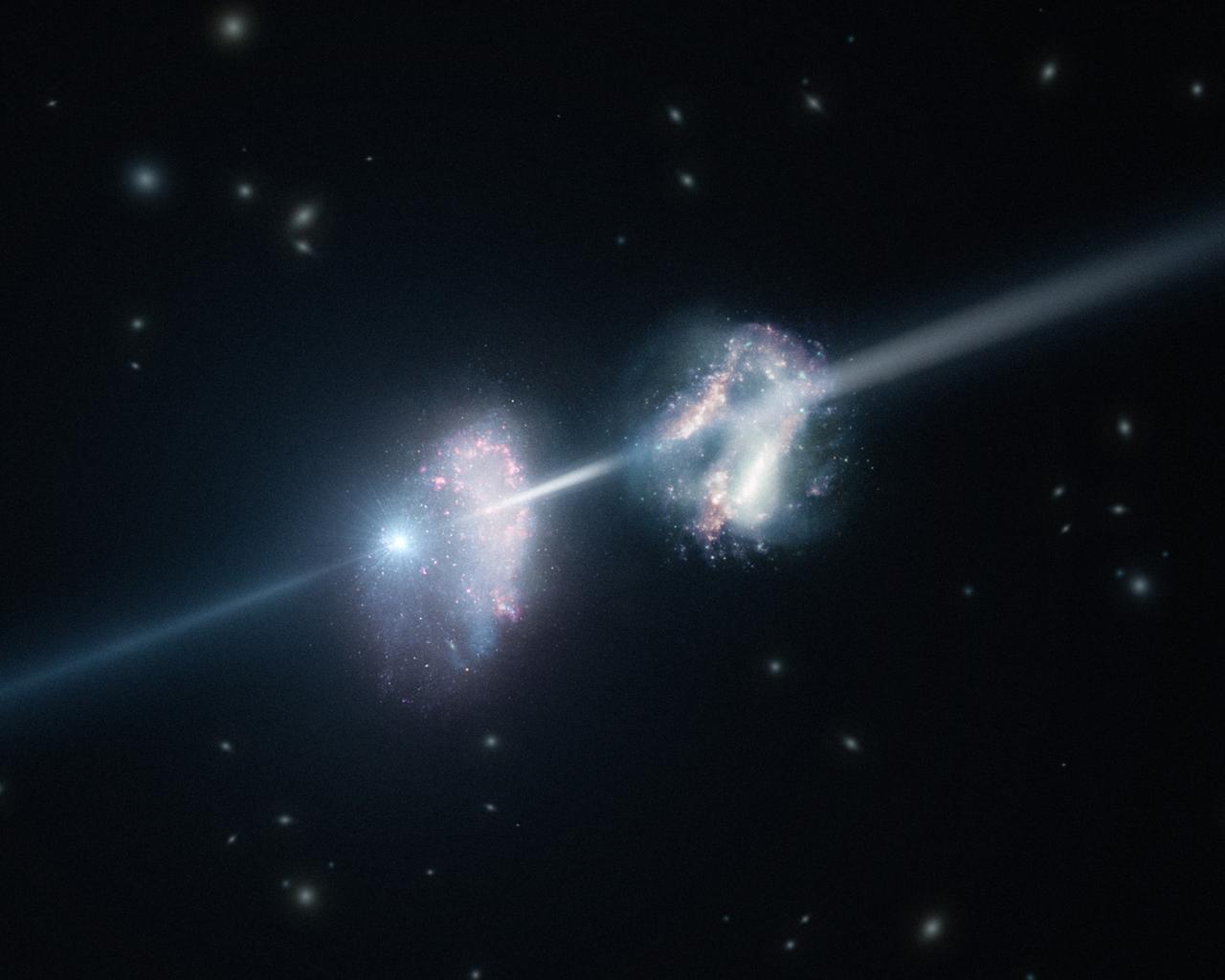 Gamma-Ray Bursts are the brightest explosions in the Universe. Astronomers think that the explosions of massive young stars power these bursts of light. An artist created this wonderful picture, which shows an unusual Gamma-Ray Burst – the burst was produced in one galaxy and it shone through a nearby galaxy as well.