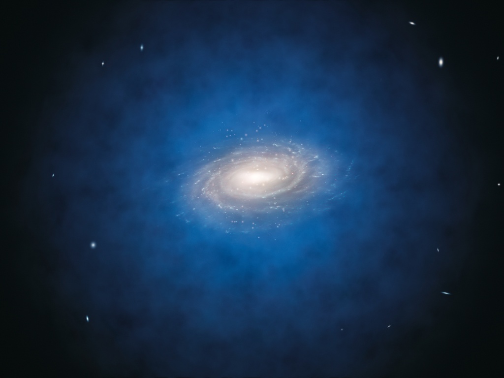 This picture shows where astronomers had expected to find dark matter (coloured blue) in and around our Galaxy. This distribution would mean that there is lots of dark matter in the region around our Sun. However, a team of astronomers has now observed the way that 400 stars near the Sun move about. From their movements, they have found no evidence for any dark matter in this region.