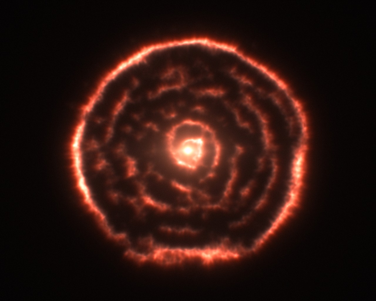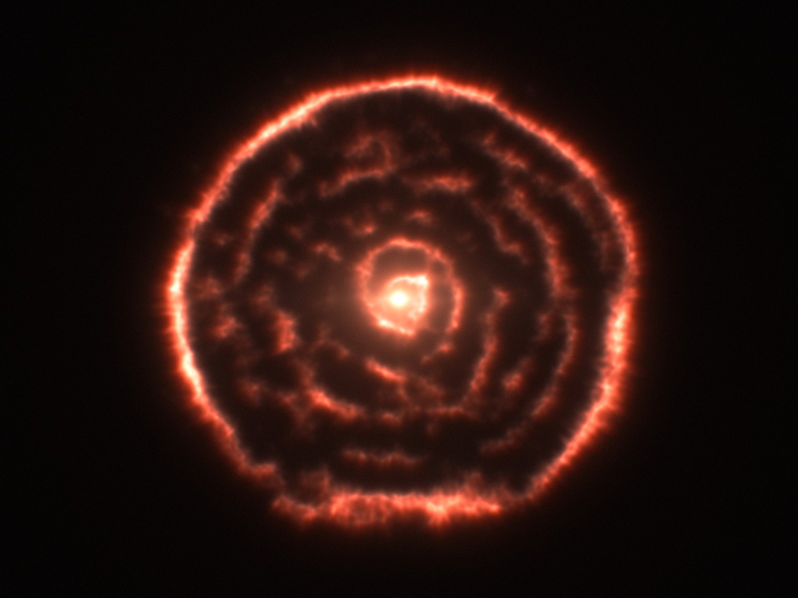 Two stars are orbiting each other, in what is called a Binary System. As one star moves it is pulling with it lose material from around its companion, twisting it into an impressive spiral shape!