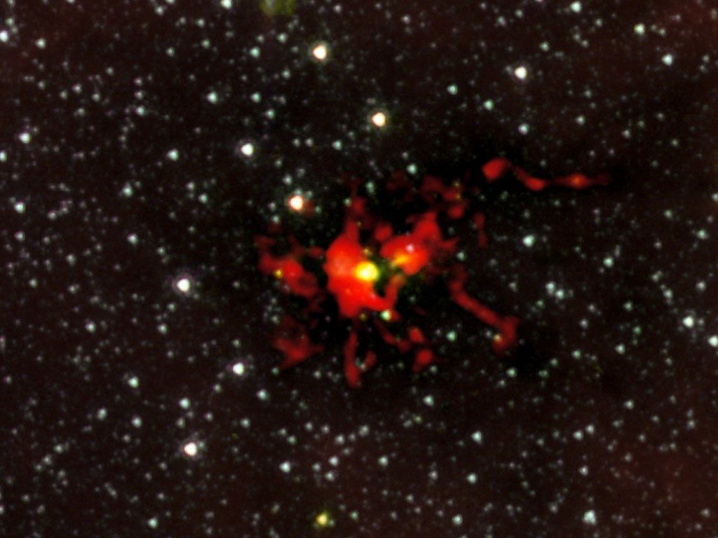 This picture shows a cloud of gas and dust that is collapsing into a truly giant star! When it is finally "born" this star will be 100 times more massive that our Sun!