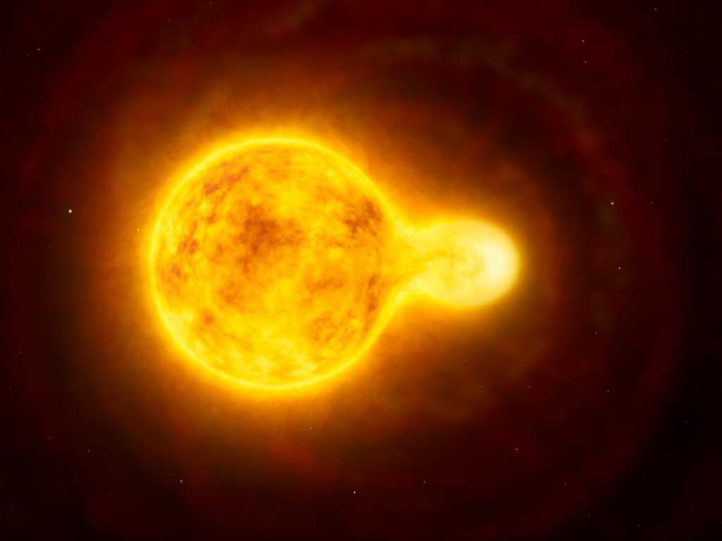 This picture is an artist’s illustration of one of the most rare and awesome stars in the Universe – a yellow hyper-giant. You can also see a smaller companion star on the right.