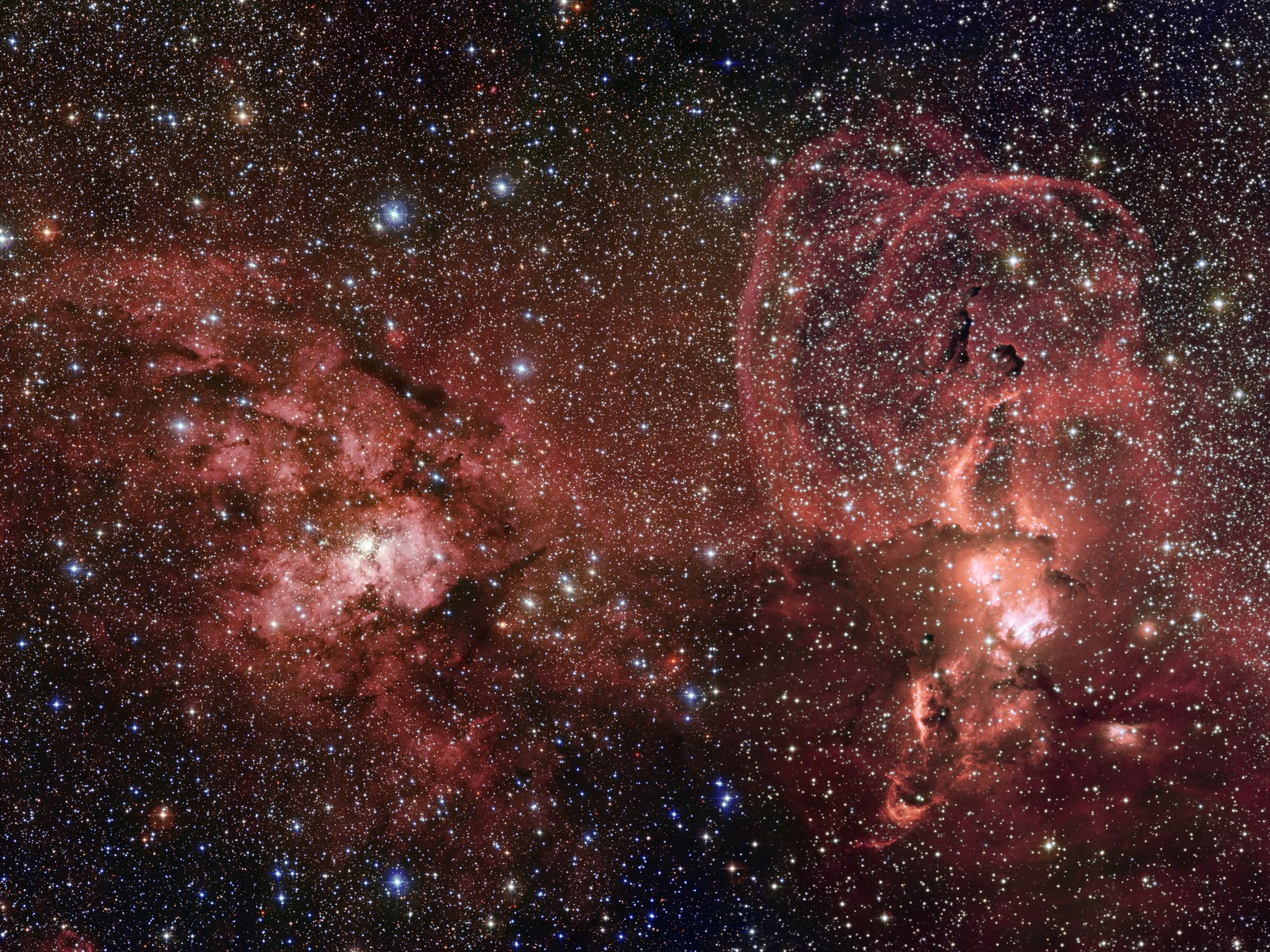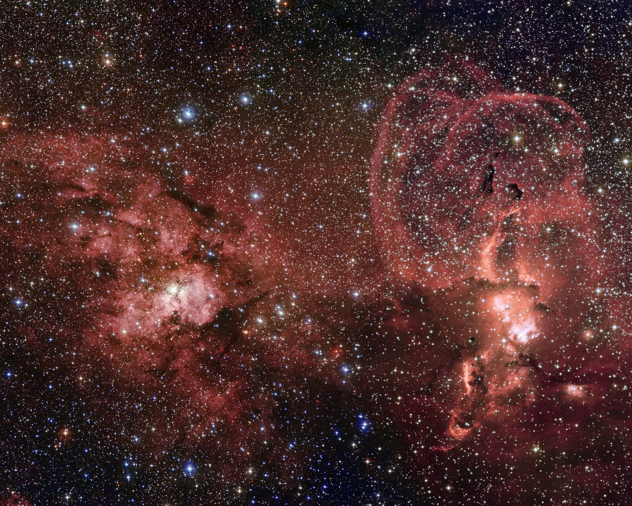This spectacular new photograph of space contains so many bright shining stars it looks like someone spilt a pot of glitter over it! This small patch of our galaxy contains thousands upon thousands of stars, and the two bright patches in the back of the picture are churning out more! On the right is a collection of glowing gas clouds called NGC 3576 and on the left is a very bright star cluster called NGC 3603.