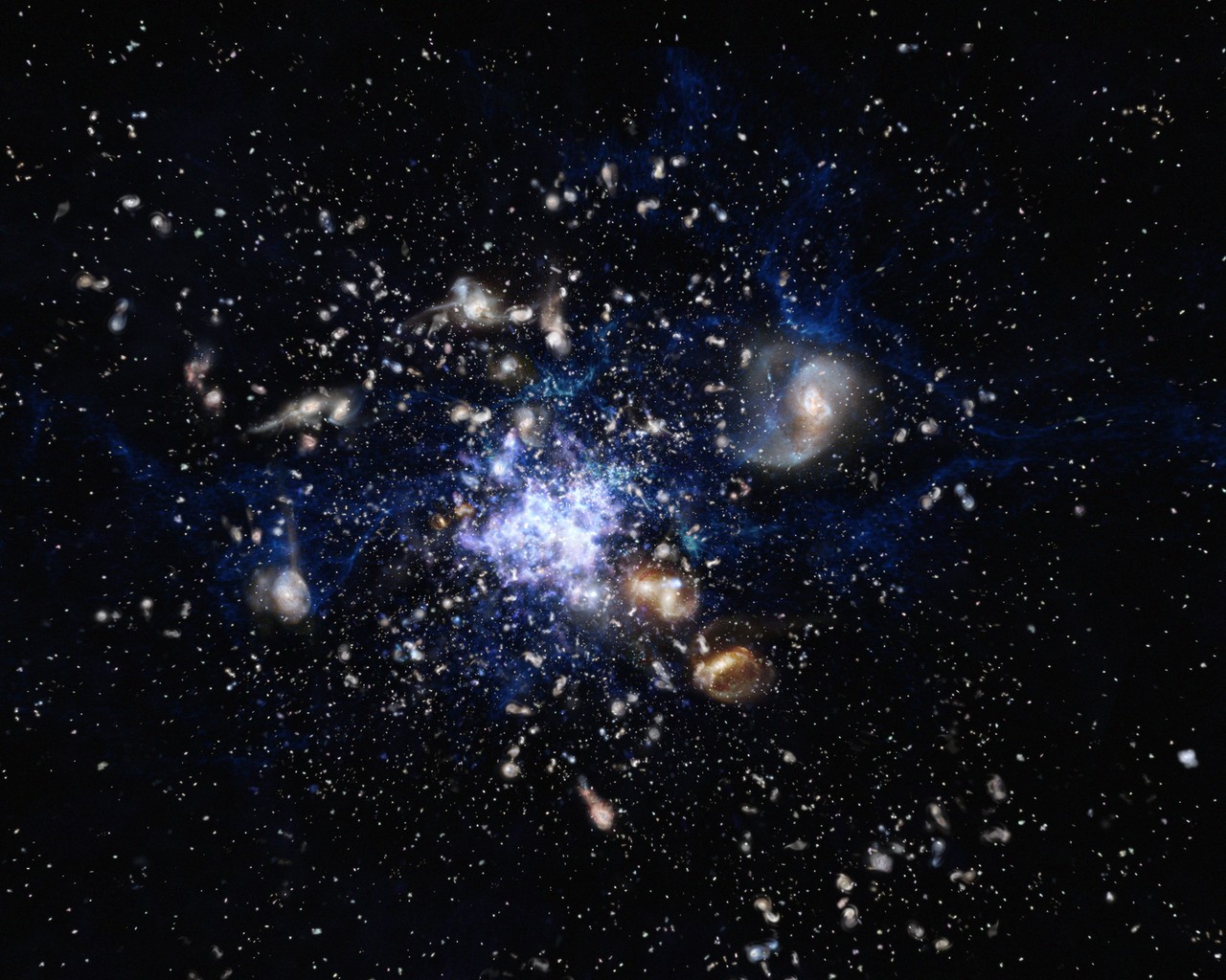 This picture was created by a talented artist and although this isn't a real photograph, it's not just a figment of the artist's imagination either. This picture was created based on real information to give us a realistic view of this galaxy cluster coming to life 10 billion years ago!