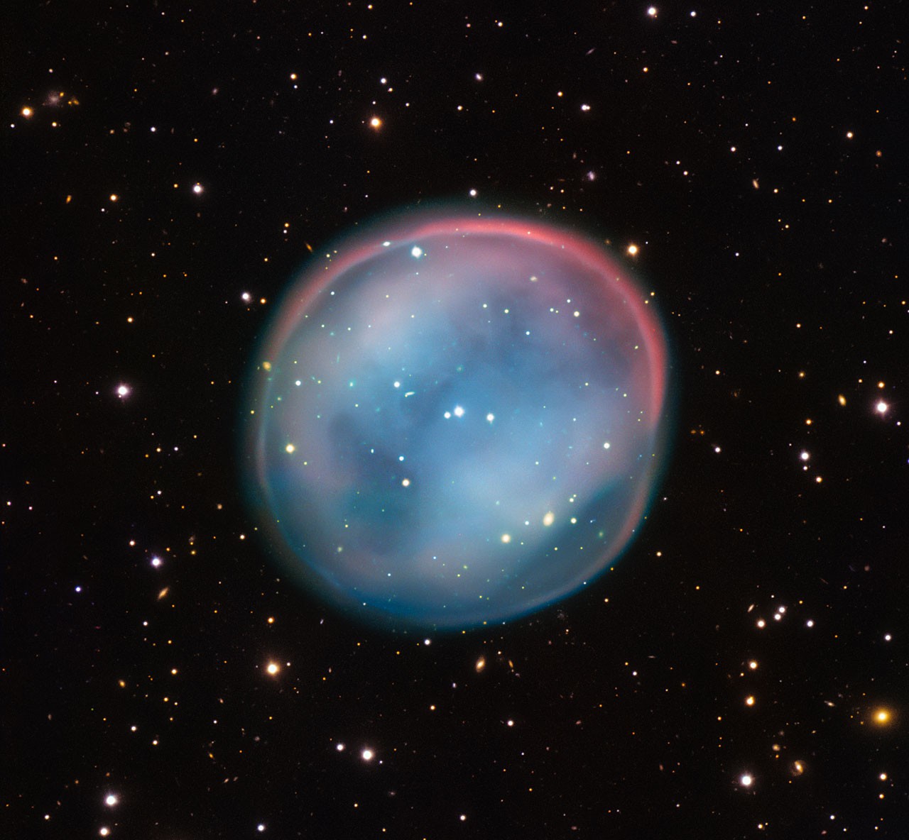 The beautiful bubble in this space photograph is the glowing ghost of a star that was caught haunting the darkness of space. The ghost is called a planetary nebula, and it’s formed from the lingering remains of a dead star. This planetary nebulae is called the Southern Owl Nebula.