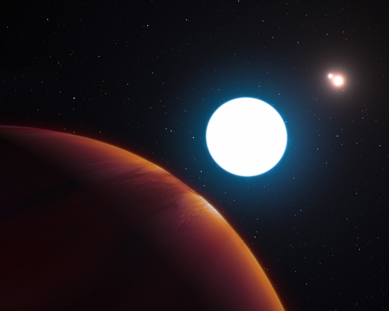 This picture was drawn by an artist to show the very distant planet HD 131399ab. This newly discovered planet orbits a star in a triple star system, meaning there are sometimes three stars in its sky at once!