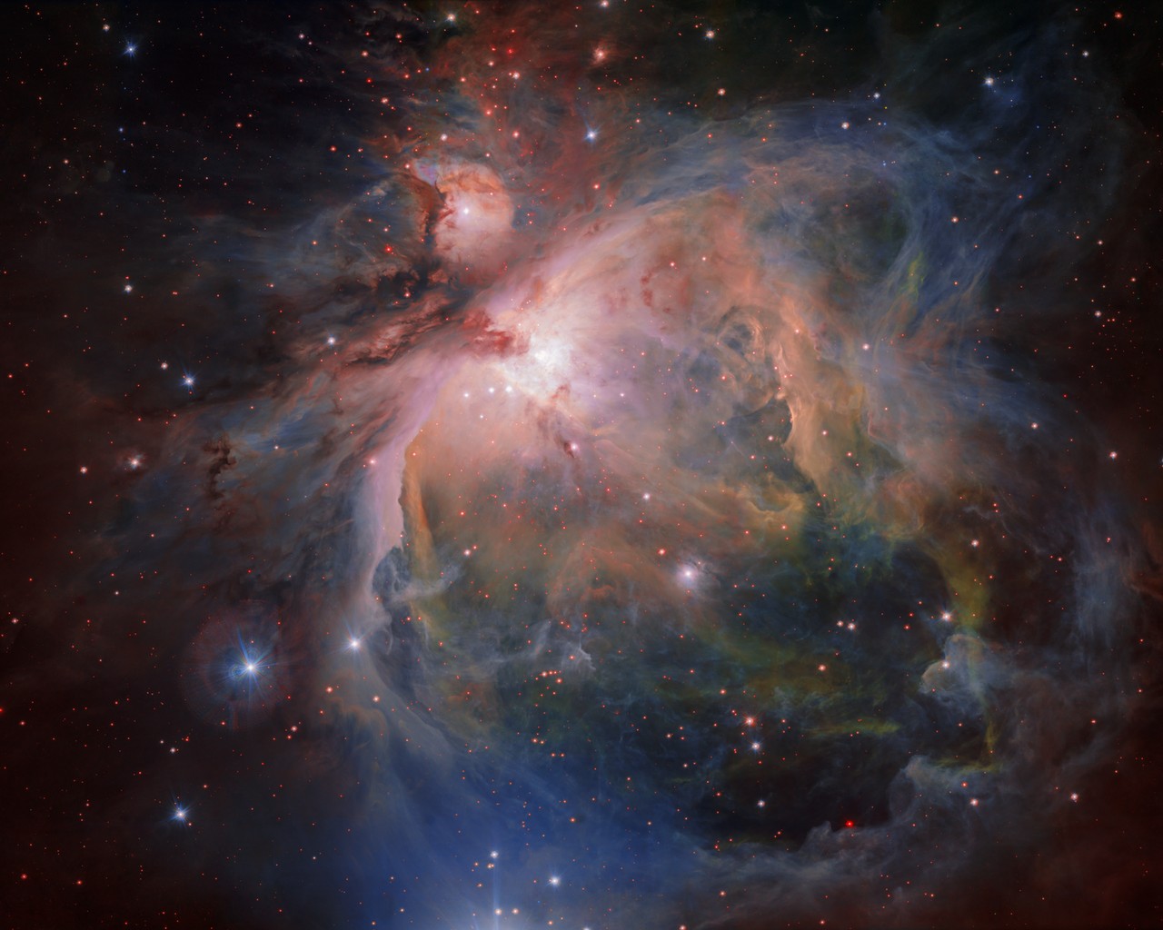 This space photograph shows the most famous star-forming cloud in the sky, the “Orion Nebula”. You can see the colourful, swirling clouds of gas that make up the nebula, along with thousands of newborn stars.