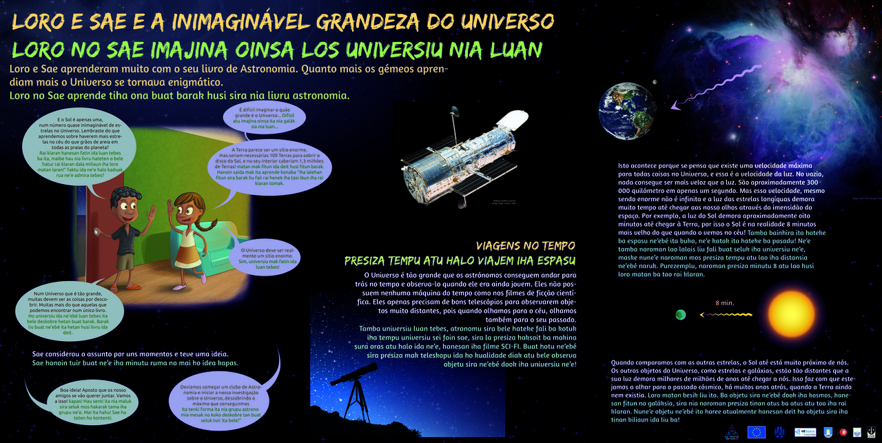 Partners: U Universe Awareness, Leiden Observatory / Leiden University, Escola Portuguesa de Díli e Ministério da Educação de Timor-Leste, Embaixada Portuguesa em Timor-Leste, Fundação Oriente, Alola Foundation, GNR Díli, Portuguese Astronomical Society, AstroBook Drive/ Boston University, ASTRON, Baader Planetarium, Berkeley Science Education Centre, Camões Institute, Ministério do Turismo de Timor-Leste, EurAstro, European Southern Observatory, Bosscha Observatory, Bandung Institute of Technology, Departamento de Física da Universidade Nacional Timor Lorosa’e, Foundation Leids Kerkhoven-Bosscha Fonds, HE Space Children’s Foundation, IAU Office of Astronomy for Development, NASA Sun-Earth Connections, PCs4kids, Art Sorrisus-Dental Implant Institute, Sália Pharmacy