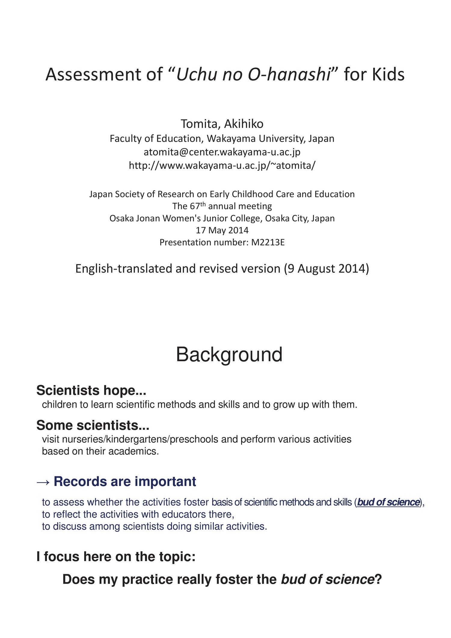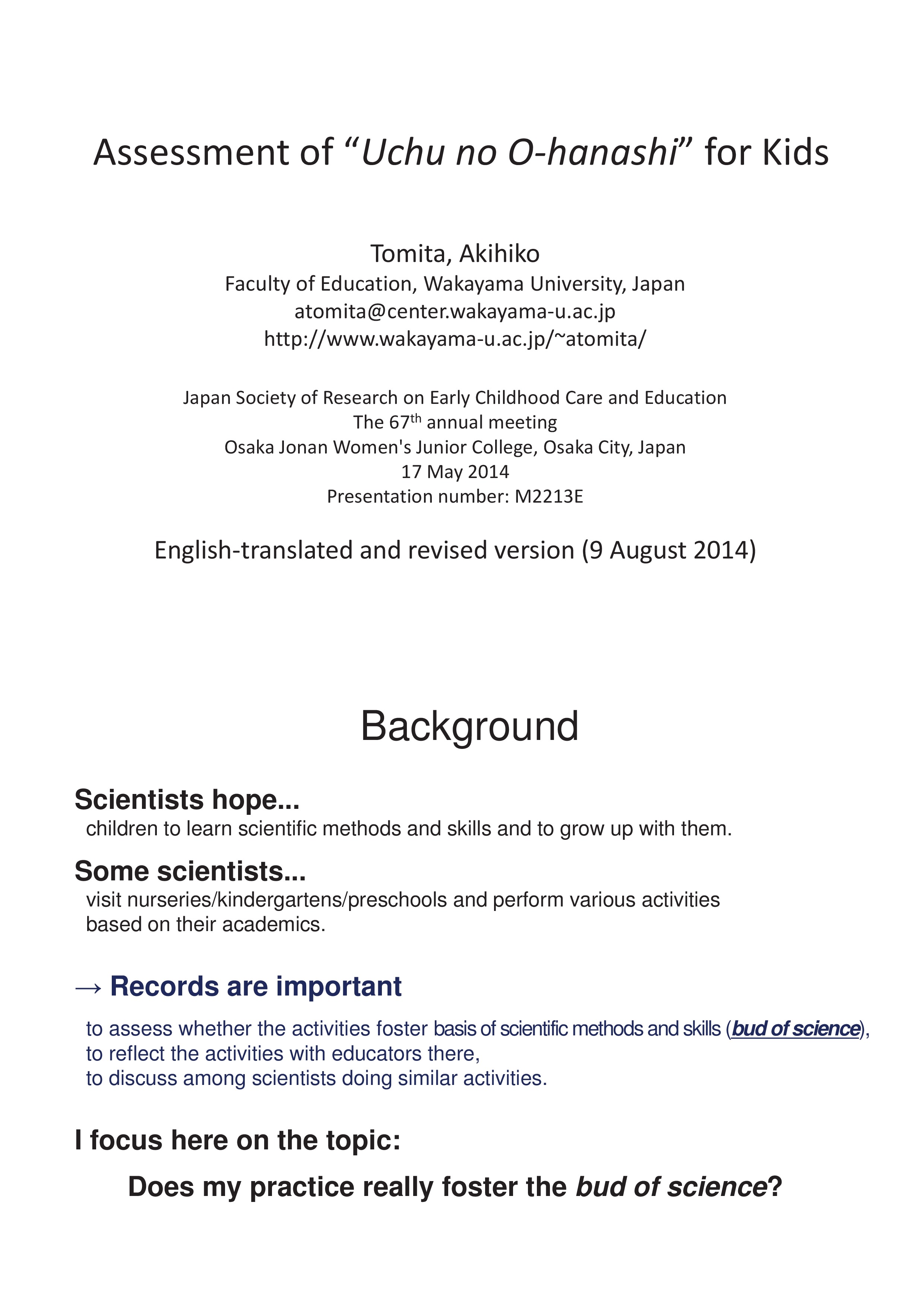 The UNAWE national node in Japan has presented the first results of its research on the impact of a certain form of astronomy education activities. The Japanese team, lead by Tomita Akihiko from the Faculty of Education at Wakayama University, implemented an activity called Uchu no O-hanashi (Story about the Universe) in many classrooms of nurseries, kindergartens and preschools for the last seven years. They researched to which extent this exercise reaches the objective of teaching the principles of science to children. To assess this, they used the four domains from UNAWE’s evaluation guide - Motivation, Scientific skills, Universe knowledge and Intercultural attitudes. This is the English version of this presentation.