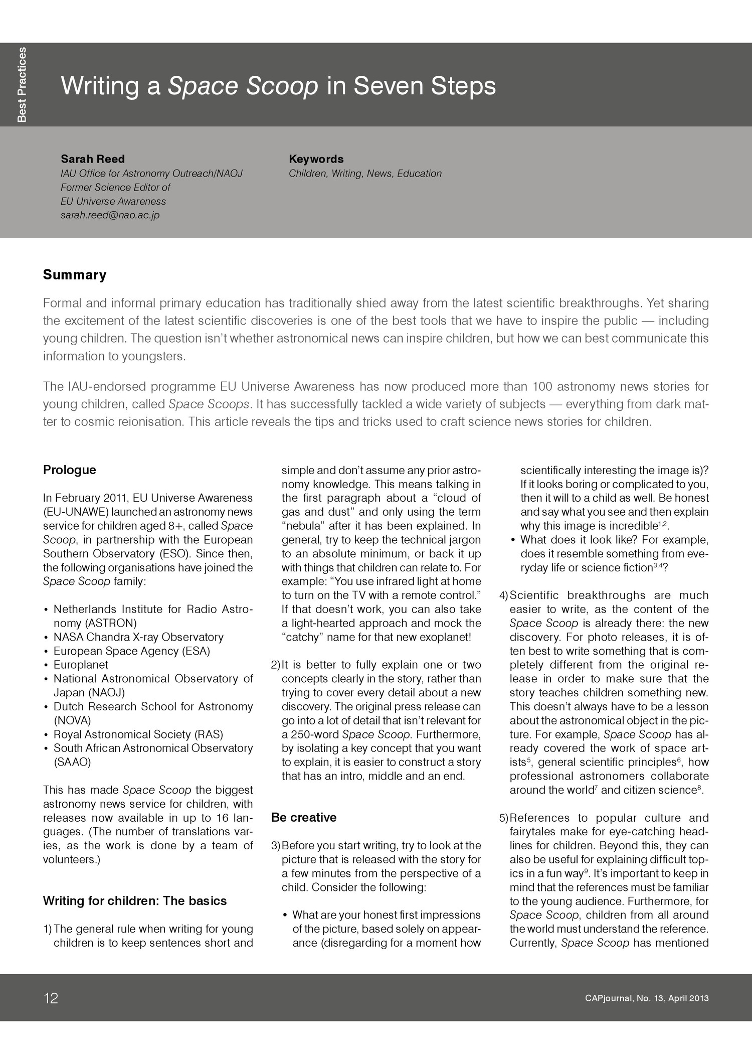 The IAU-endorsed programme EU Universe Awareness has now produced more than 100 astronomy news stories for young children, called Space Scoops. It has successfully tackled a wide variety of subjects — everything from dark matter to cosmic reionisation. This article reveals the tips and tricks used to craft science news stories for children.
