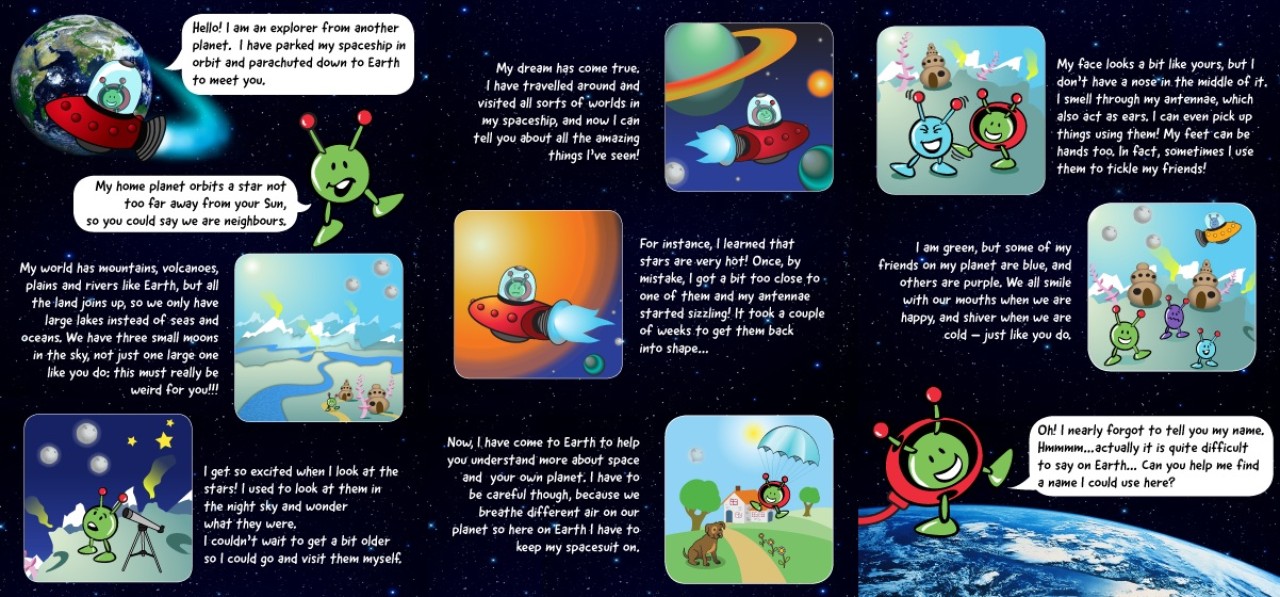 After travelling millions of miles from a far away planet, this little green alien has parked his spaceship and parachuted down to Earth to learn about our home and teach us about all the wonders of the cosmos he's seen on his travels. But his name is too difficult for human tongues to say, so we need to give him a new name.